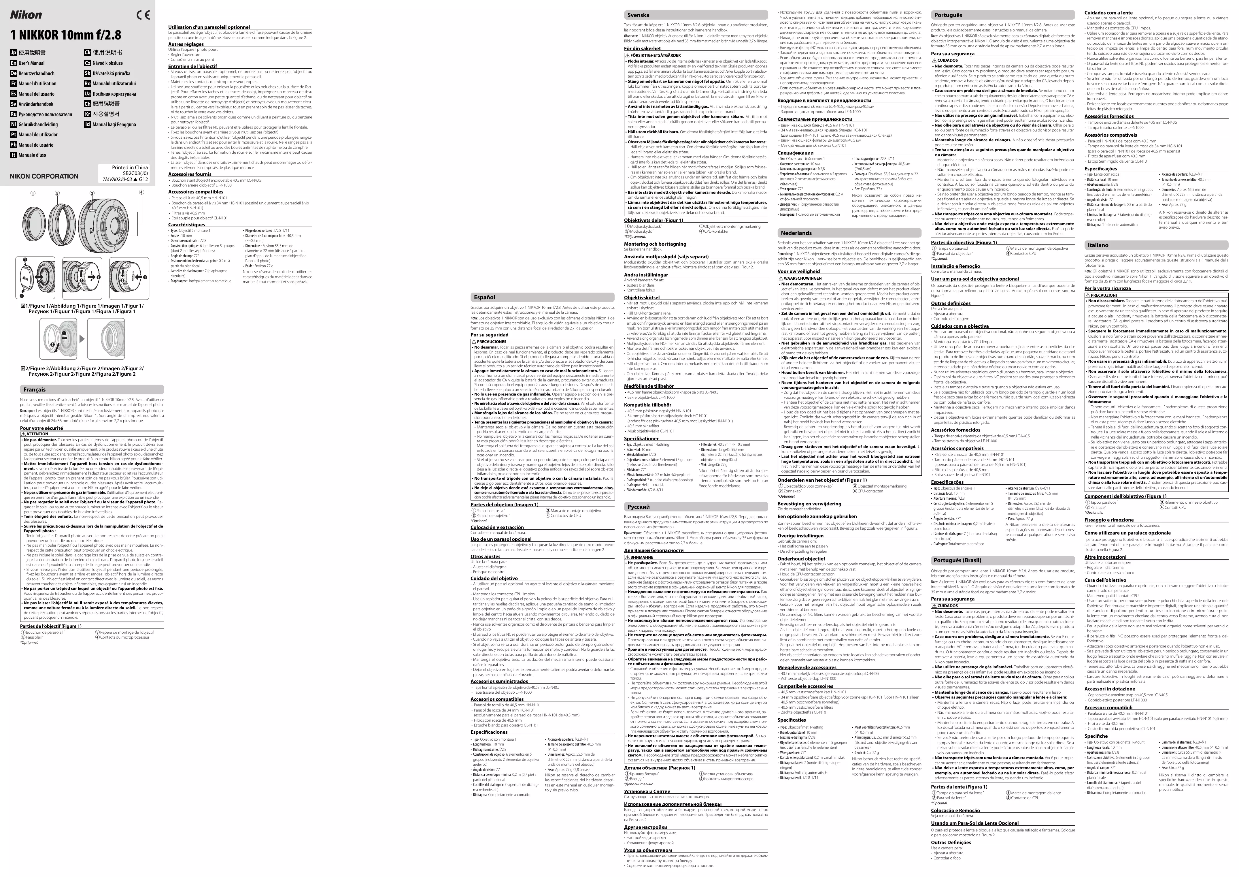 Français Nous vous remercions d’avoir acheté un objectif 1 NIKKOR 10mm f/2.8. Avant d’utiliser ce produit, veuillez lire attentivement à la fois ces instructions et le manuel de l’appareil photo. Remarque : Les objectifs 1 NIKKOR sont destinés exclusivement aux appareils photo numériques à objectif interchangeable Nikon 1. Son angle de champ est équivalent à celui d’un objectif 24×36 mm doté d’une focale environ 2,7 × plus longue.