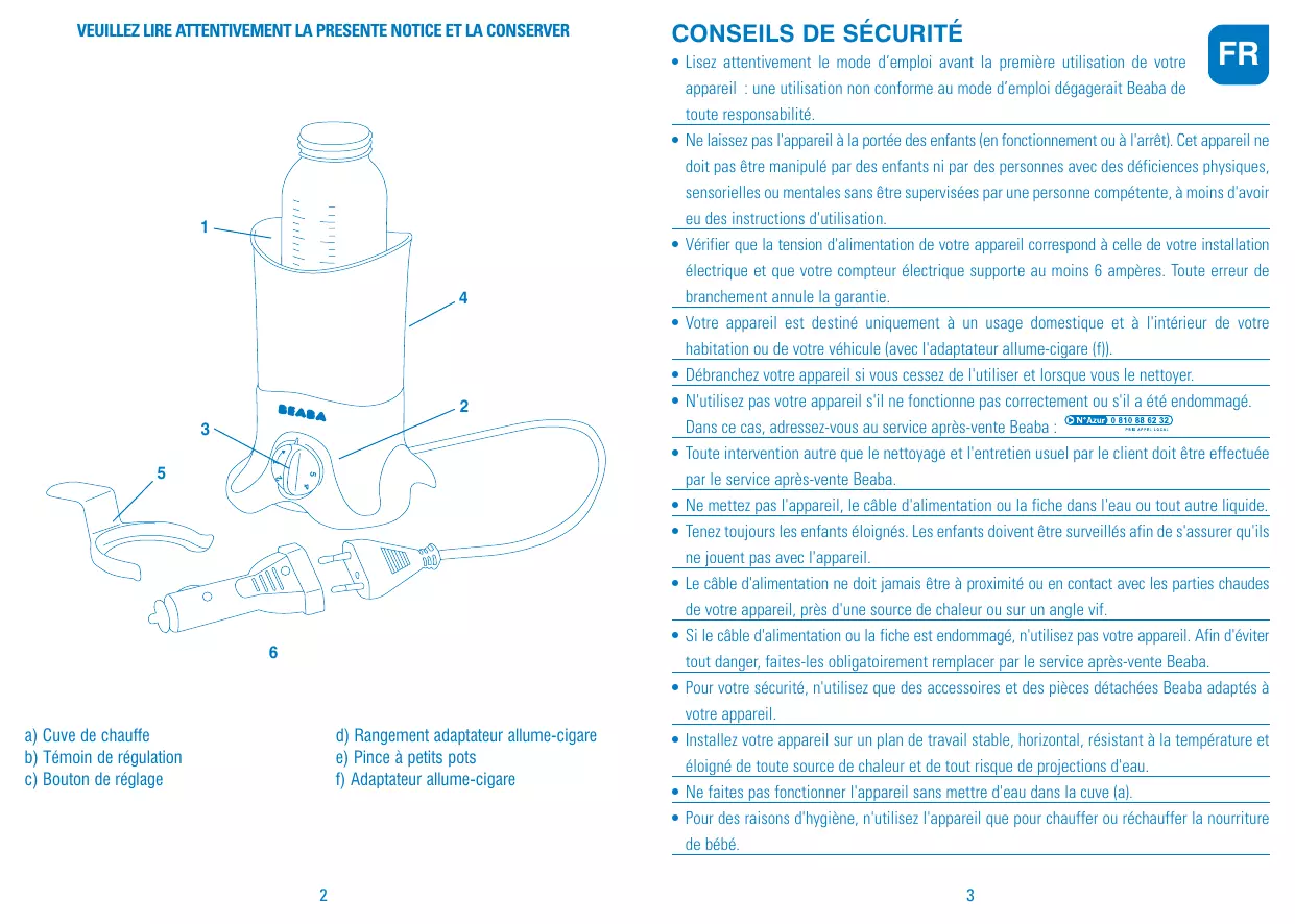 • Lisez attentivement le mode d’emploi avant la première utilisation de votre appareil : une utilisation non conforme au mode d’emploi dégagerait Beaba de toute responsabilité. • Ne laissez pas l'appareil à la portée des enfants (en fonctionnement ou à l'arrêt). Cet appareil ne doit pas être manipulé par des enfants ni par des personnes avec des déficiences physiques, sensorielles ou mentales sans être supervisées par une personne compétente, à moins d'avoir eu des instructions d'utilisation. • Vérifier que la tension d'alimentation de votre appareil correspond à celle de votre installation électrique et que votre compteur électrique supporte au moins 6 ampères. Toute erreur de branchement annule la garantie. • Votre appareil est destiné uniquement à un usage domestique et à l'intérieur de votre habitation ou de votre véhicule (avec l'adaptateur allume-cigare (f)). • Débranchez votre appareil si vous cessez de l'utiliser et lorsque vous le nettoyer. • N'utilisez pas votre appareil s'il ne fonctionne pas correctement ou s'il a été endommagé. Dans ce cas, adressez-vous au service après-vente Beaba : • Toute intervention autre que le nettoyage et l'entretien usuel par le client doit être effectuée par le service après-vente Beaba. • Ne mettez pas l'appareil, le câble d'alimentation ou la fiche dans l'eau ou tout autre liquide. • Tenez toujours les enfants éloignés. Les enfants doivent être surveillés afin de s'assurer qu'ils ne jouent pas avec l'appareil. • Le câble d'alimentation ne doit jamais être à proximité ou en contact avec les parties chaudes de votre appareil, près d'une source de chaleur ou sur un angle vif. • Si le câble d'alimentation ou la fiche est endommagé, n'utilisez pas votre appareil. Afin d'éviter tout danger, faites-les obligatoirement remplacer par le service après-vente Beaba. • Pour votre sécurité, n'utilisez que des accessoires et des pièces détachées Beaba adaptés à votre appareil. • Installez votre appareil sur un plan de travail stable, horizontal, résistant à la température et éloigné de toute source de chaleur et de tout risque de projections d'eau. • Ne faites pas fonctionner l'appareil sans mettre d'eau dans la cuve (a). • Pour des raisons d'hygiène, n'utilisez l'appareil que pour chauffer ou réchauffer la nourriture de bébé. 3