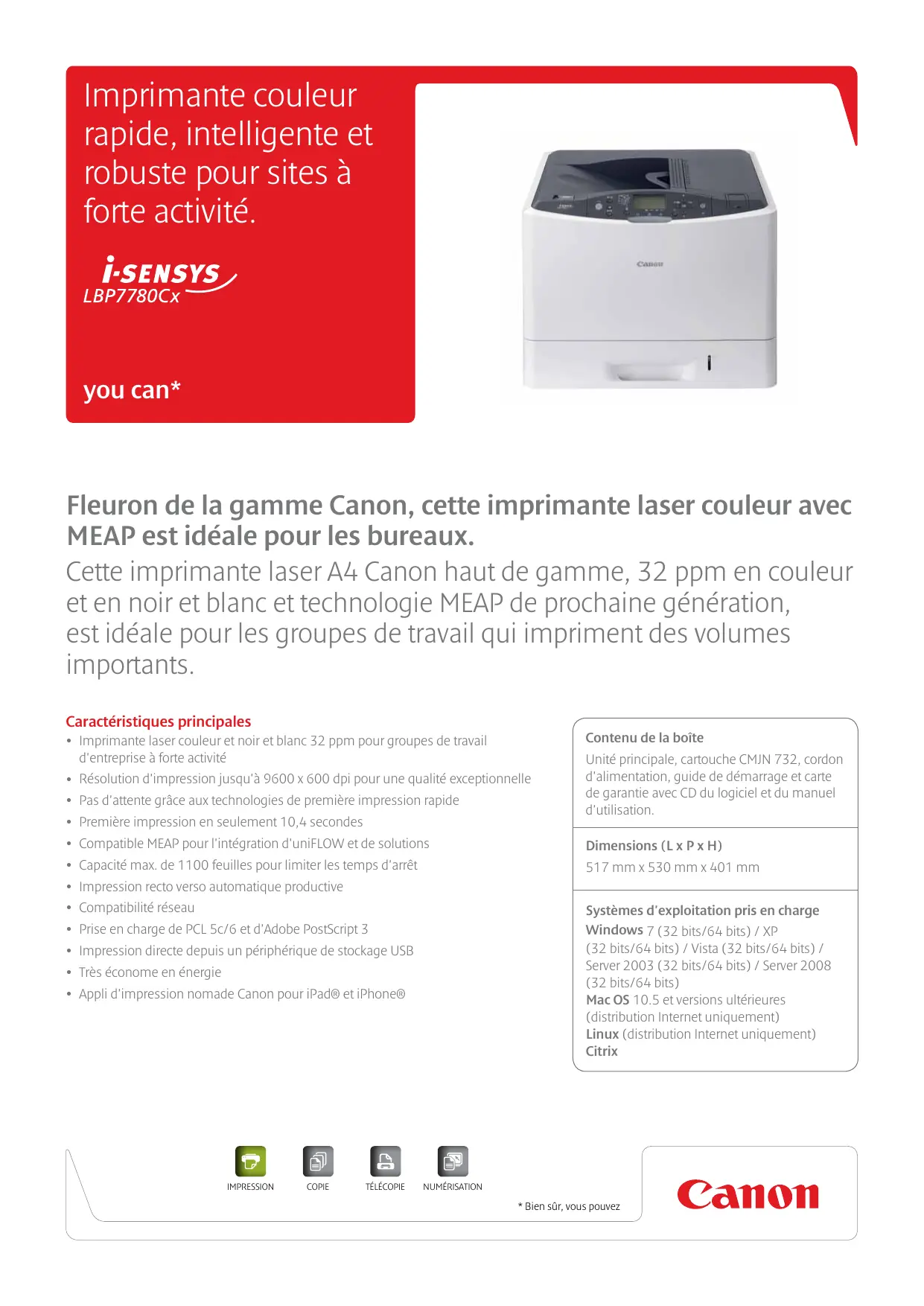 Résolution d'impression jusqu'à 9600 x 600 dpi pour une qualité exceptionnelle Pas d'attente grâce aux technologies de première impression rapide Première impression en seulement 10,4 secondes Contenu de la boîte Unité principale, cartouche CMJN 732, cordon d'alimentation, guide de démarrage et carte de garantie avec CD du logiciel et du manuel d'utilisation. Compatible MEAP pour l'intégration d'uniFLOW et de solutions Dimensions (L x P x H) Capacité max. de 1100 feuilles pour limiter les temps d'arrêt 517 mm x 530 mm x 401 mm Impression recto verso automatique productive Compatibilité réseau Systèmes d'exploitation pris en charge Windows 7 (32 bits/64 bits) / XP (32 bits/64 bits) / Vista (32 bits/64 bits) / Server 2003 (32 bits/64 bits) / Server 2008 (32 bits/64 bits) Mac OS 10.5 et versions ultérieures (distribution Internet uniquement) Linux (distribution Internet uniquement) Citrix Prise en charge de PCL 5c/6 et d'Adobe PostScript 3 Impression directe depuis un périphérique de stockage USB Très économe en énergie Appli d'impression nomade Canon pour iPad® et iPhone® IMPRESSION COPIE