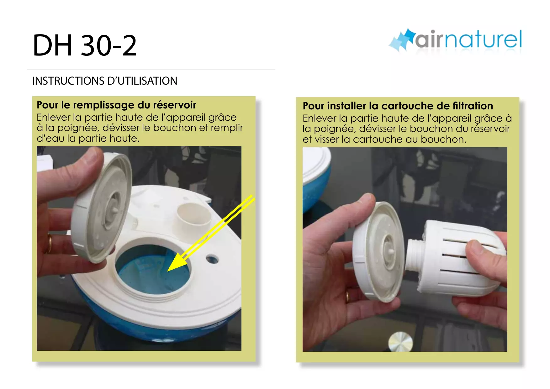 Pour le remplissage du réservoir Enlever la partie haute de l’appareil grâce à la poignée, dévisser le bouchon et remplir d’eau la partie haute. Pour installer la cartouche de filtration Enlever la partie haute de l’appareil grâce à la poignée, dévisser le bouchon du réservoir et visser la cartouche au bouchon. Informations importantes de sécurité Merci d’avoir acheté un produit AIR NATUREL, lisez attentivement les instructions avant de faire fonctionner votre appareil et conservez cette notice pour référence ultérieure. Placer l’appareil hors de portée d’un enfant Ne pas laisser les enfant jouer avec l’emballage (sac plastique etc.) Cet appareil n’est pas prévu pour être utilisé par des personnes (y compris les enfants) dont les capacités physiques, sensorielles ou mentales sont réduites, ou des personnes dénuées d’expérience ou de connaissance, sauf si elles ont pu bénéficier, par l’intermédiaire d’une personne responsable de leur sécurité, d’une surveillance ou d’instructions préalables concernant l’utilisation de l’appareil ». Il convient de surveiller les enfants pour s’assurer qu’ils ne jouent pas avec l’appareil L’appareil fonctionne sous 220 Volts. Verifiez que cela correspond bien à votre installation Placer l’appareil sur une surface sèche, éviter les surfaces avec du nylon ou inflammable, les radiateur et autre sources de chaleur Toujours débrancher l’appareil lors du remplissage de la cuve ainsi que lors de sa manipulation Ne remplir la cuve qu’avec de l’eau L’appareil est prévue pour fonctionner dans une pièce ouverte. Ne pas positionner la sortie d’humidité directement sur un mur ou sur une prise électrique Pour éviter le risque de choc électrique ne pas exposer le câble d’alimentation à des surfaces humides ou mouillées. Ne laisser jamais un enfant utiliser l’appareil N’utilisez pas l’appareil si il est endommagé Ne pas introduire d’objet métallique d’aucune sorte dans l’appareil Ne pas mouiller l’appareil, le nettoyer avec un chiffon humide et bien le sécher avant de rebrancher l’appareil et de le remettre en fonction-