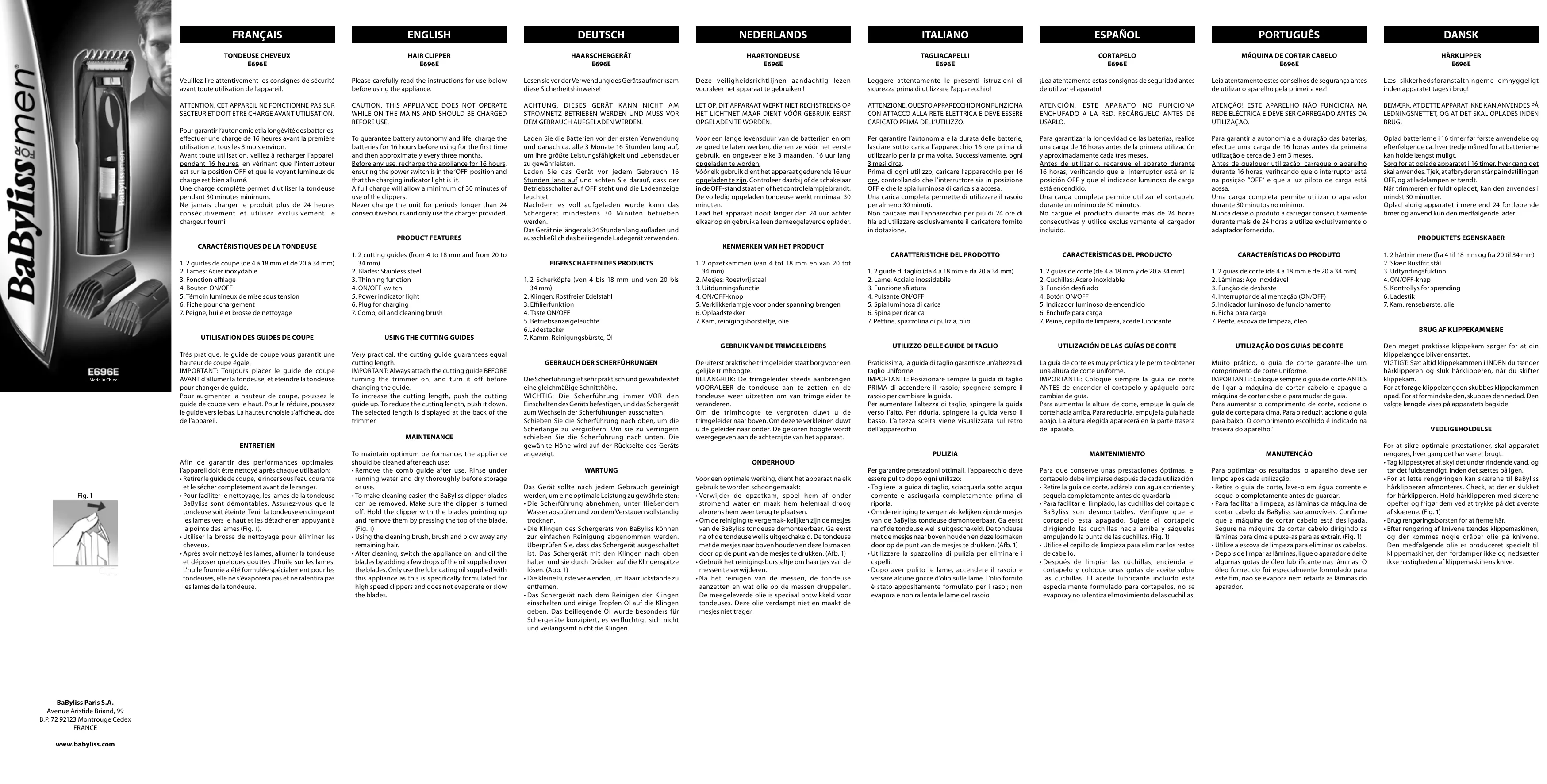 Très pratique, le guide de coupe vous garantit une hauteur de coupe égale. IMPORTANT: Toujours placer le guide de coupe AVANT d’allumer la tondeuse, et éteindre la tondeuse pour changer de guide. Pour augmenter la hauteur de coupe, poussez le guide de coupe vers le haut. Pour la réduire, poussez le guide vers le bas. La hauteur choisie s’affiche au dos de l’appareil. Very practical, the cutting guide guarantees equal cutting length. IMPORTANT: Always attach the cutting guide BEFORE turning the trimmer on, and turn it off before changing the guide. To increase the cutting length, push the cutting guide up. To reduce the cutting length, push it down. The selected length is displayed at the back of the trimmer. ENTRETIEN Fig. 1 BaByliss Paris S.A. Avenue Aristide Briand, 99 B.P. 72 92123 Montrouge Cedex FRANCE www.babyliss.com PRODUCT FEATURES Afin de garantir des performances optimales, l’appareil doit être nettoyé après chaque utilisation: