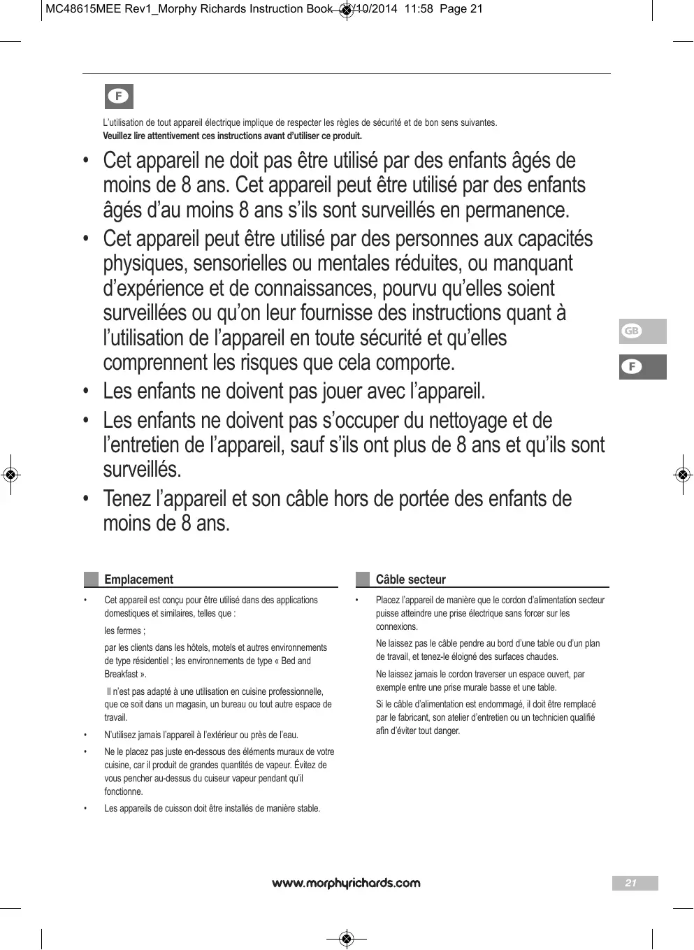 1 Les produits Morphy Richards sont concus pour uneusage exclusivement domestique. Voir les limitations d'usage dans le sous-titre Positionnement des Consignes de sécurité importantes, Morphy Richards s'engage a mener une politique d'amélioration continue en termes de qualité et de conception. Le fabricant se reserve donc le droit de modifier sans prévis à la specification de ses modélles.