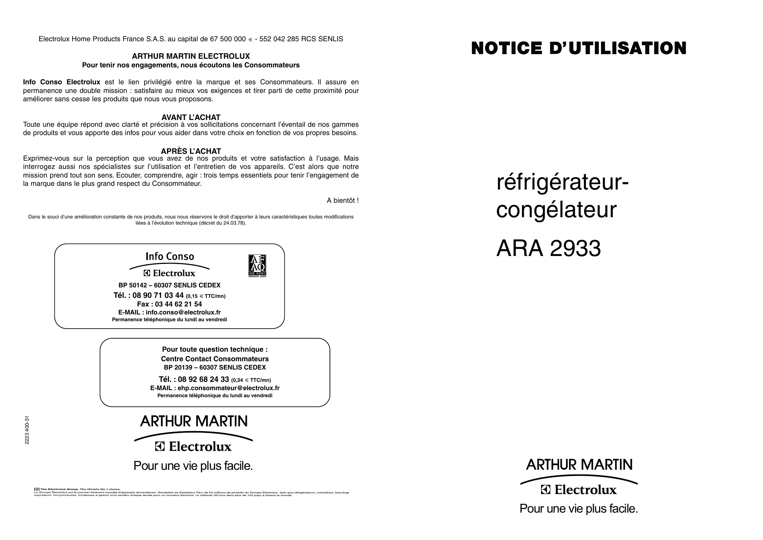 Exprimez-vous sur la perception que vous avez de nos produits et votre satisfaction à l’usage. Mais interrogez aussi nos spécialistes sur l’utilisation et l’entretien de vos appareils. C’est alors que notre mission prend tout son sens. Ecouter, comprendre, agir : trois temps essentiels pour tenir l’engagement de la marque dans le plus grand respect du Consommateur. A bientôt ! Dans le souci d’une amélioration constante de nos produits, nous nous réservons le droit d’apporter à leurs caractéristiques toutes modifications liées à l’évolution technique (décret du 24.03.78). réfrigérateurcongélateur ARA 2933 ISO 9OO1 VERSION 2000