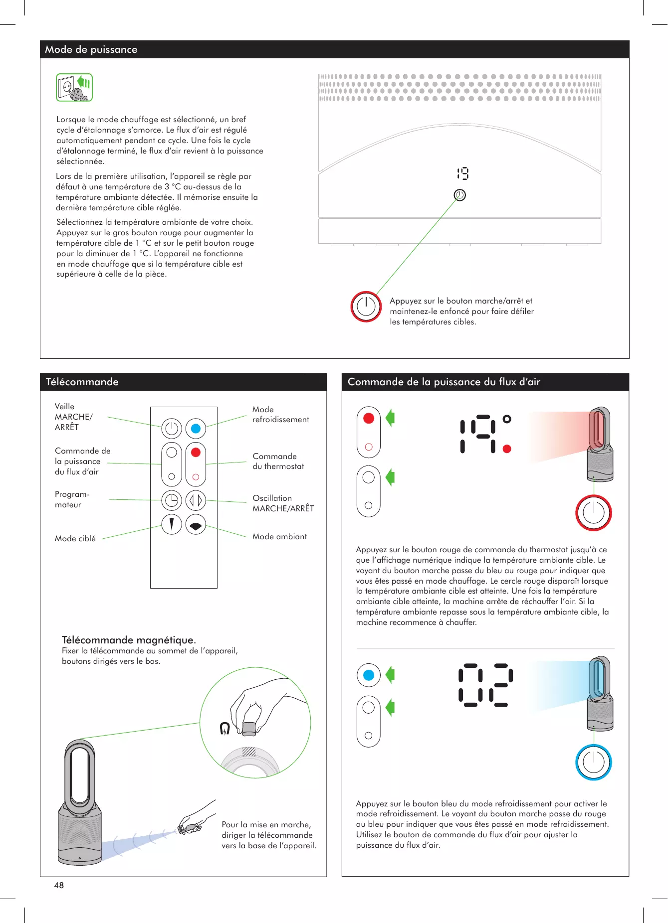 Sélectionnez la température ambiante de votre choix. Appuyez sur le gros bouton rouge pour augmenter la température cible de 1 °C et sur le petit bouton rouge pour la diminuer de 1 °C. L’appareil ne fonctionne en mode chauffage que si la température cible est supérieure à celle de la pièce. Appuyez sur le bouton marche/arrêt et maintenez-le enfoncé pour faire défiler les températures cibles.