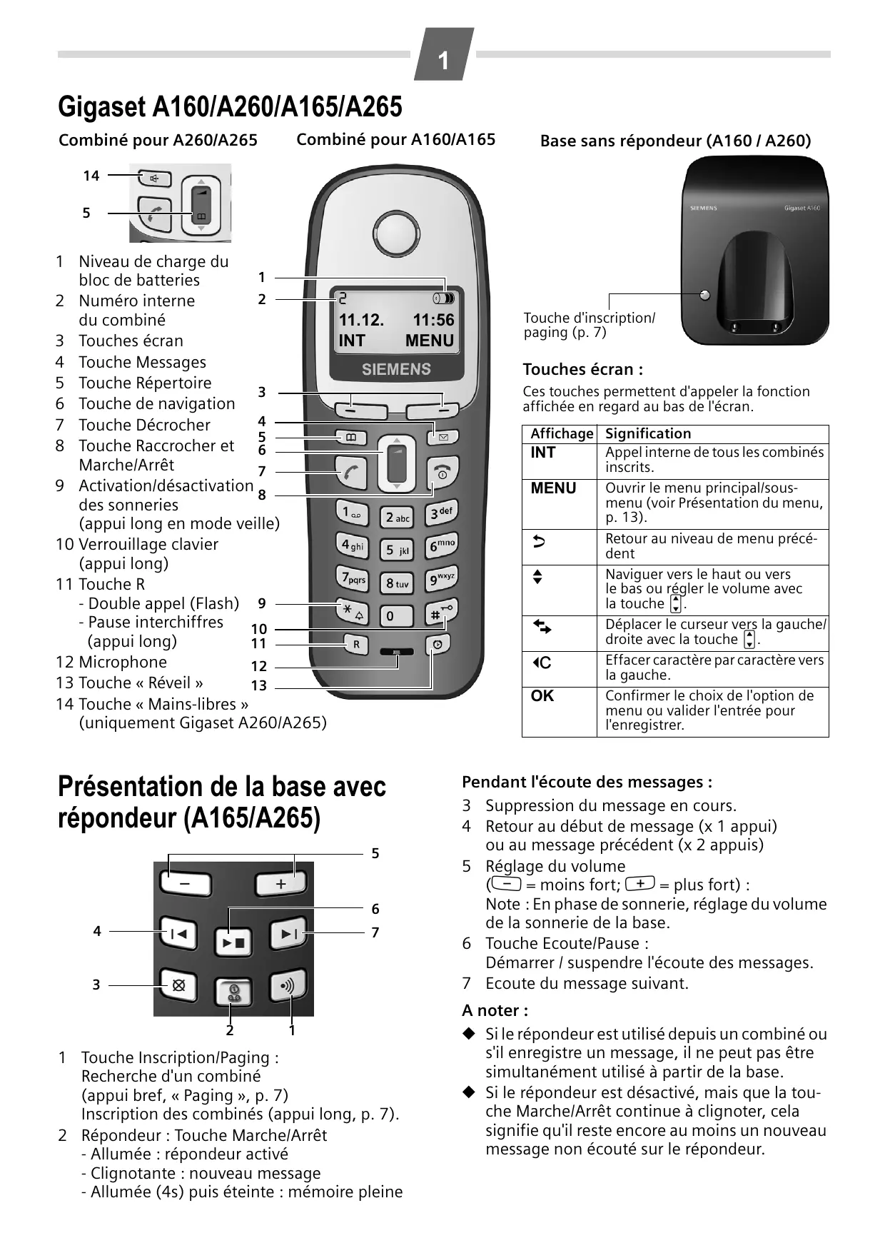 Utilisation du répondeur (A165/A265) Vous pouvez utiliser le répondeur au moyen du combiné (voir Présentation du menu, p. 13) ou des touches de la base (p. 1).