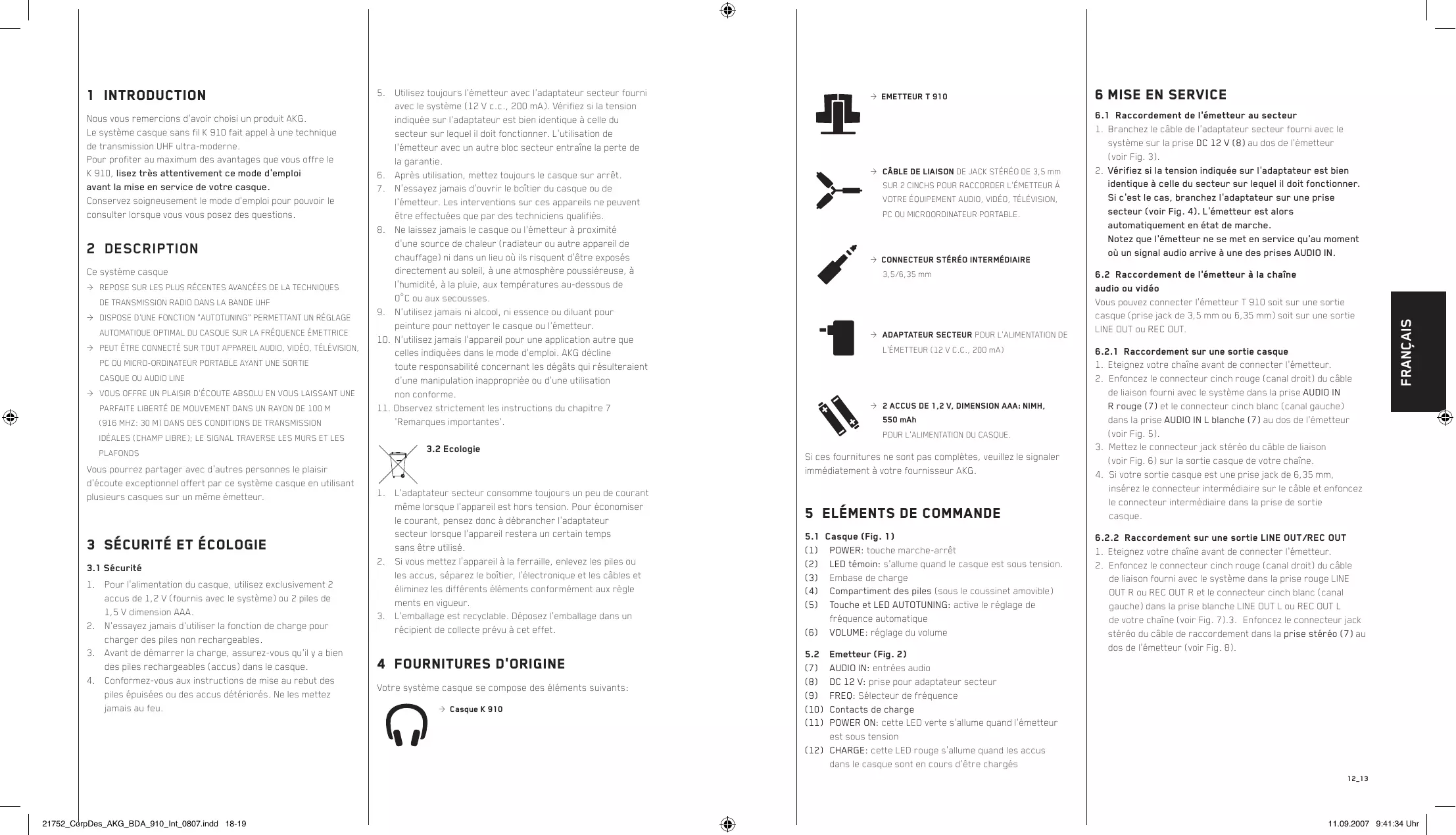 Nous vous remercions d’avoir choisi un produit AKG. Le système casque sans fil K 910 fait appel à une technique de transmission UHF ultra-moderne. Pour profiter au maximum des avantages que vous offre le K 910, lisez très attentivement ce mode d’emploi avant la mise en service de votre casque. Conservez soigneusement le mode d’emploi pour pouvoir le consulter lorsque vous vous posez des questions.