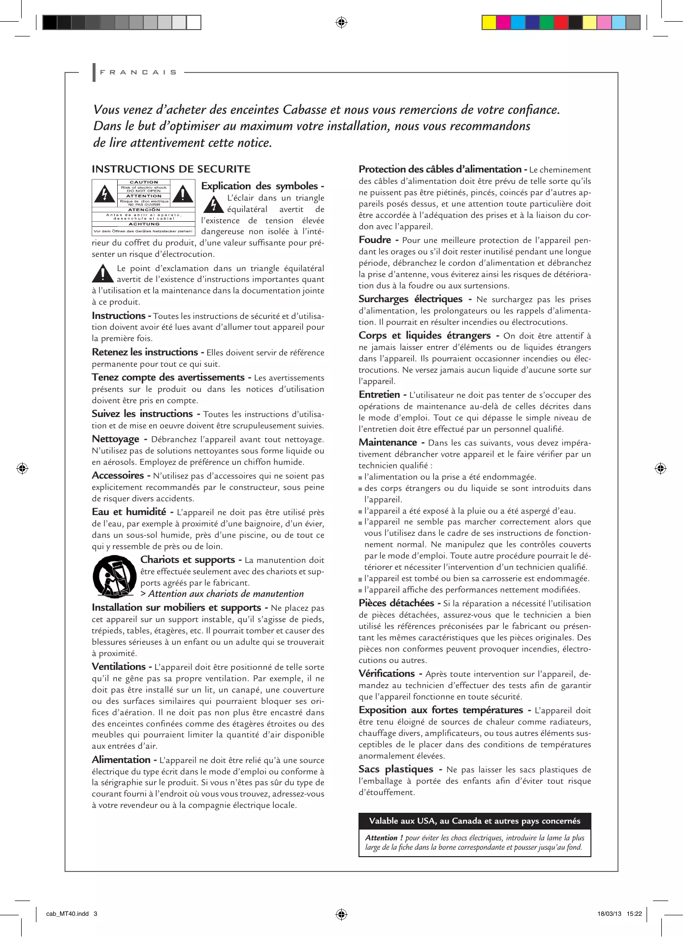 cab_MT40.indd 2 18/03/13 15:22 francais Vous venez d’acheter des enceintes Cabasse et nous vous remercions de votre confiance. Dans le but d’optimiser au maximum votre installation, nous vous recommandons de lire attentivement cette notice.