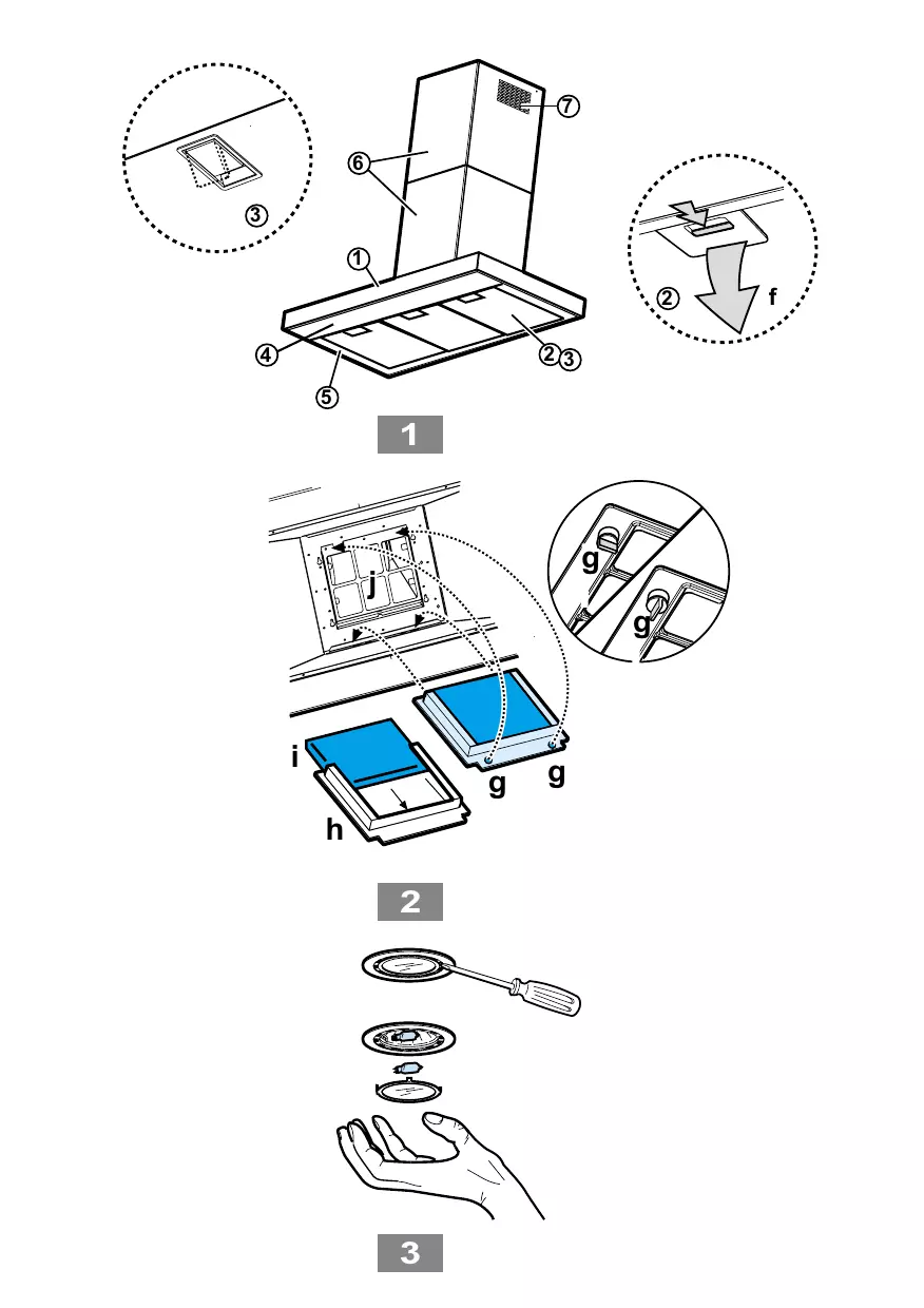 Description de la hotte Fig. 1 1 Panneau de contrôle 2 Filtre anti-graisse 3 Panneaux ramasse-graisse (prévus uniquement pour quelques modèles) 4 Lampe 5 Écran vapeurs 6 Cheminée télescopique 7 Sortie de lair (uniquement pour emploi dans la version filtrante) Fonctionnement Modèle avec contrôles électroniques