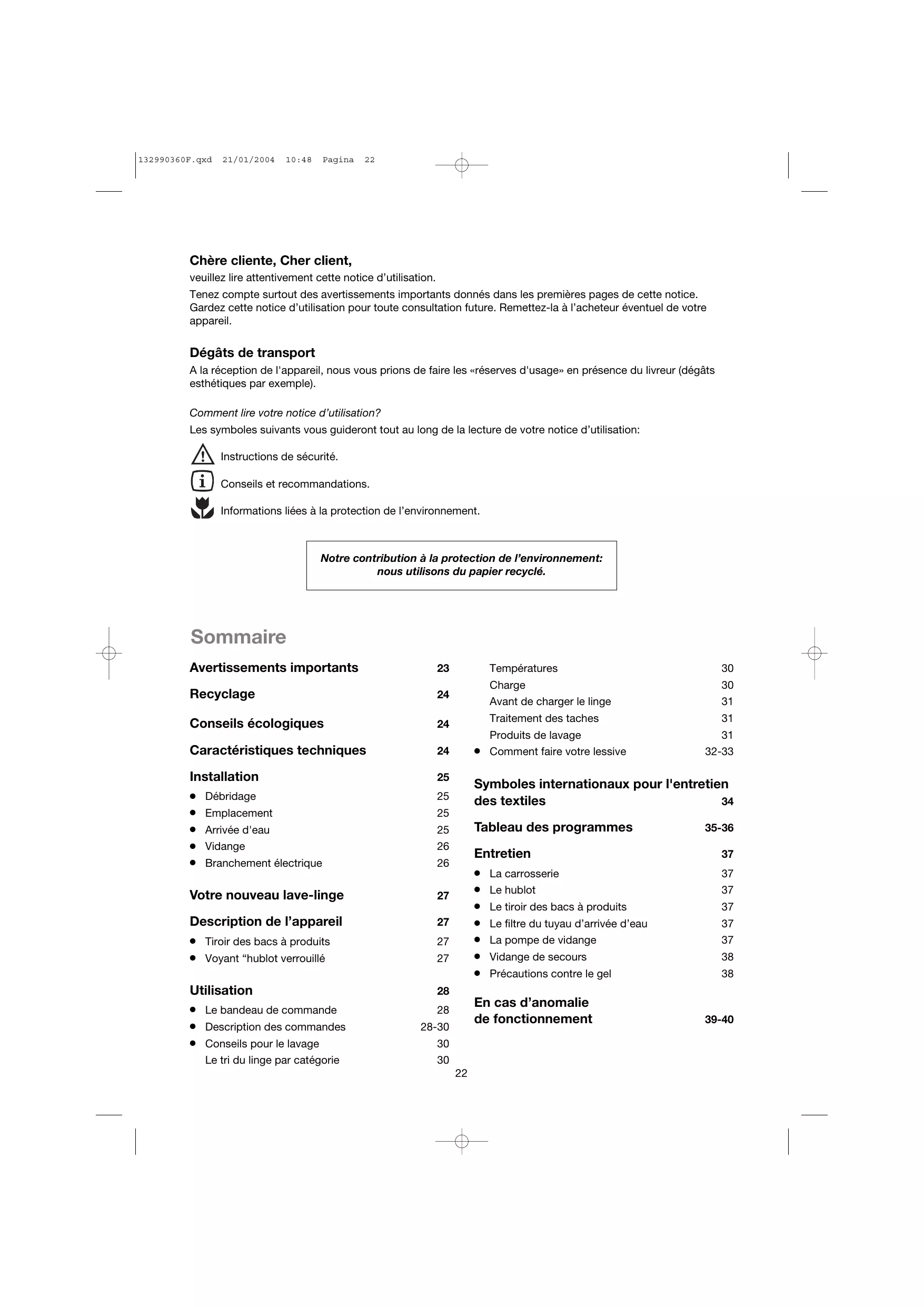 Comment faire votre lessive 32-33 Symboles internationaux pour l'entretien des textiles Tableau des programmes 35-36 Entretien