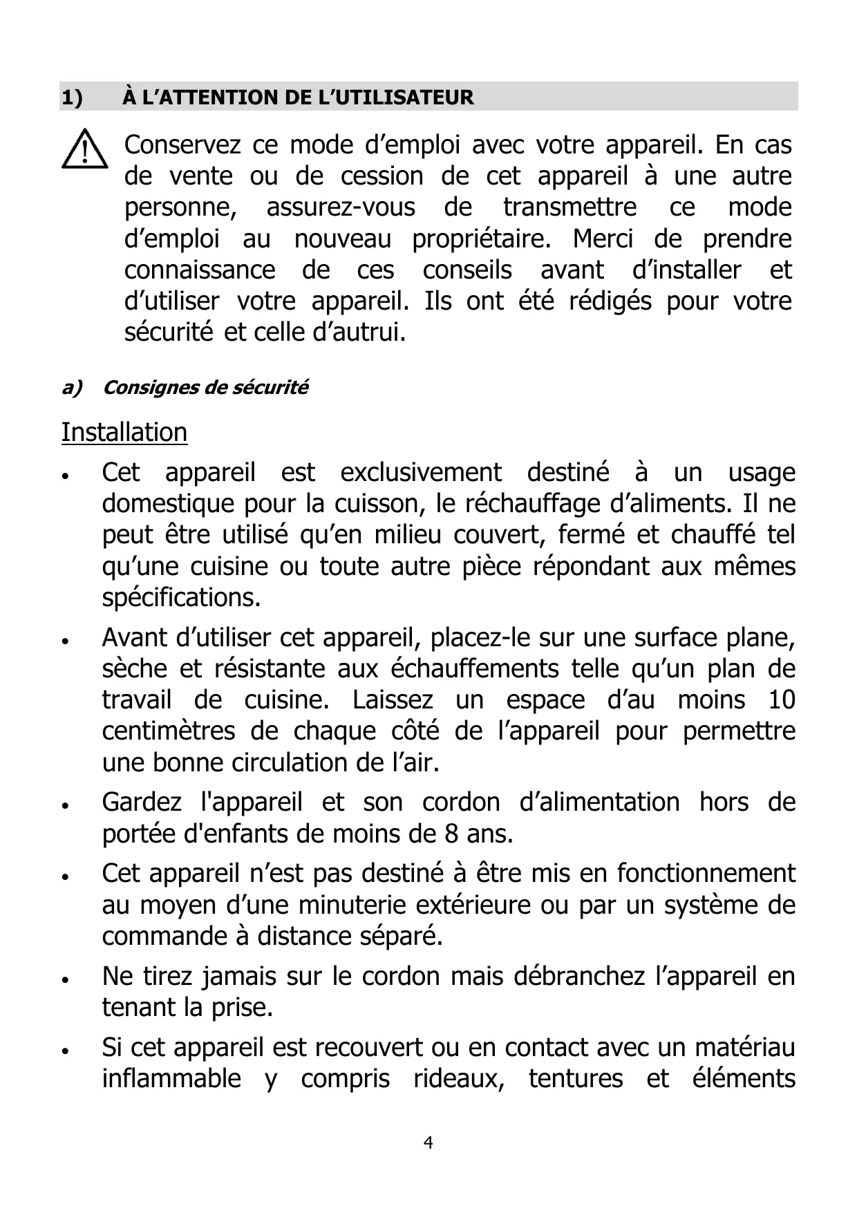 Cet appareil est exclusivement destiné à un usage domestique pour la cuisson, le réchauffage d’aliments. Il ne peut être utilisé qu’en milieu couvert, fermé et chauffé tel qu’une cuisine ou toute autre pièce répondant aux mêmes spécifications. Avant d’utiliser cet appareil, placez-le sur une surface plane, sèche et résistante aux échauffements telle qu’un plan de travail de cuisine. Laissez un espace d’au moins 10 centimètres de chaque côté de l’appareil pour permettre une bonne circulation de l’air. Gardez l'appareil et son cordon d’alimentation hors de portée d'enfants de moins de 8 ans. Cet appareil n’est pas destiné à être mis en fonctionnement au moyen d’une minuterie extérieure ou par un système de commande à distance séparé. Ne tirez jamais sur le cordon mais débranchez l’appareil en tenant la prise. Si cet appareil est recouvert ou en contact avec un matériau inflammable y compris rideaux, tentures et éléments 4