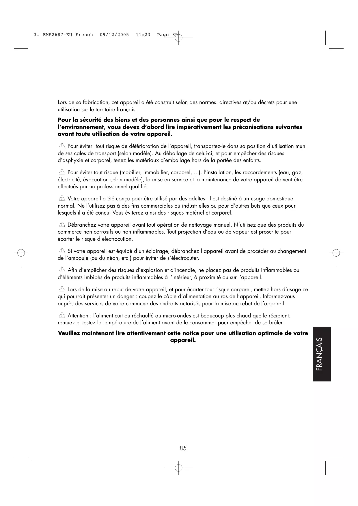 09/12/2005 11:23 Page 85 Lors de sa fabrication, cet appareil a été construit selon des normes. directives at/ou décrets pour une utilisation sur le territoire français. Pour la sécurité des biens et des personnes ainsi que pour le respect de l’environnement, vous devez d’abord lire impérativement les préconisations suivantes avant toute utilisation de votre appareil. Pour éviter tout risque de détérioration de l’appareil, transportez-le dans sa position d’utilisation muni de ses cales de transport (selon modèle). Au déballage de celui-ci, et pour empêcher des risques d’asphyxie et corporel, tenez les matériaux d’emballage hors de la portée des enfants. Pour éviter tout risque (mobilier, immobilier, corporel, ...), l’installation, les raccordements (eau, gaz, électricité, évacuation selon modèle), la mise en service et la maintenance de votre appareil doivent être effectués par un professionnel qualifié. Votre appareil a été conçu pour être utilisé par des adultes. Il est destiné à un usage domestique normal. Ne l’utilisez pas à des fins commerciales ou industrielles ou pour d’autres buts que ceux pour lesquels il a été conçu. Vous éviterez ainsi des risques matériel et corporel. Débranchez votre appareil avant tout opération de nettoyage manuel. N’utilisez que des produits du commerce non corrosifs ou non inflammables. Tout projection d’eau ou de vapeur est proscrite pour écarter le risque d’électrocution. Si votre appareil est équipé d’un éclairage, débranchez l’appareil avant de procéder au changement de l’ampoule (ou du néon, etc.) pour éviter de s’électrocuter. Afin d’empêcher des risques d’explosion et d’incendie, ne placez pas de produits inflammables ou d’éléments imbibés de produits inflammables à l’intérieur, à proximité ou sur l’appareil. Lors de la mise au rebut de votre appareil, et pour écarter tout risque corporel, mettez hors d’usage ce qui pourrait présenter un danger : coupez le câble d’alimentation au ras de l’appareil. Informez-vous auprès des services de votre commune des endroits autorisés pour la mise au rebut de l’appareil. Veuillez maintenant lire attentivement cette notice pour une utilisation optimale de votre appareil.