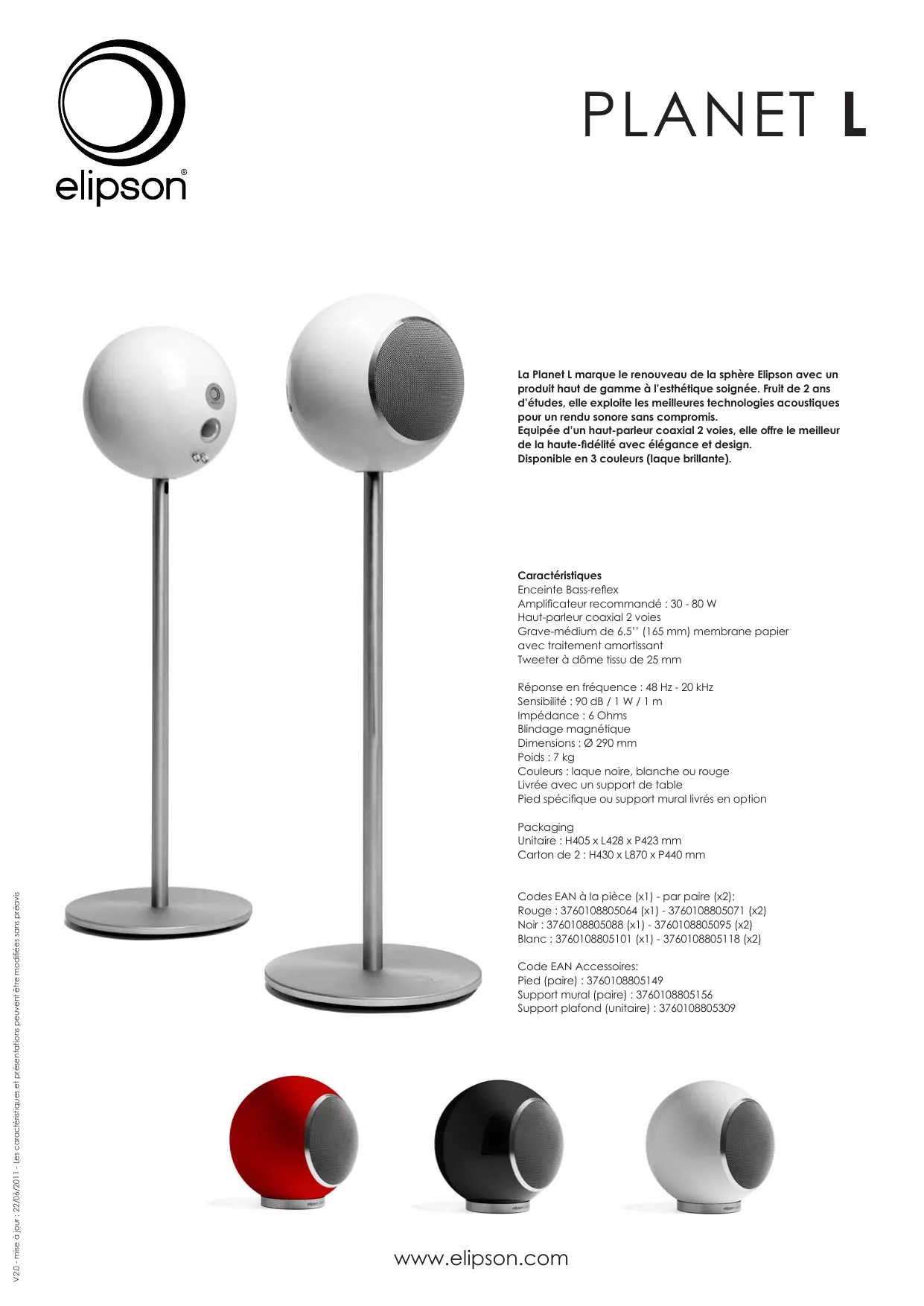 Codes EAN à la pièce (x1) - par paire (x2): Rouge : 3760108805064 (x1) - 3760108805071 (x2) Noir : 3760108805088 (x1) - 3760108805095 (x2) Blanc : 3760108805101 (x1) - 3760108805118 (x2) Code EAN Accessoires: Pied (paire) : 3760108805149 Support mural (paire) : 3760108805156 Support plafond (unitaire) : 3760108805309