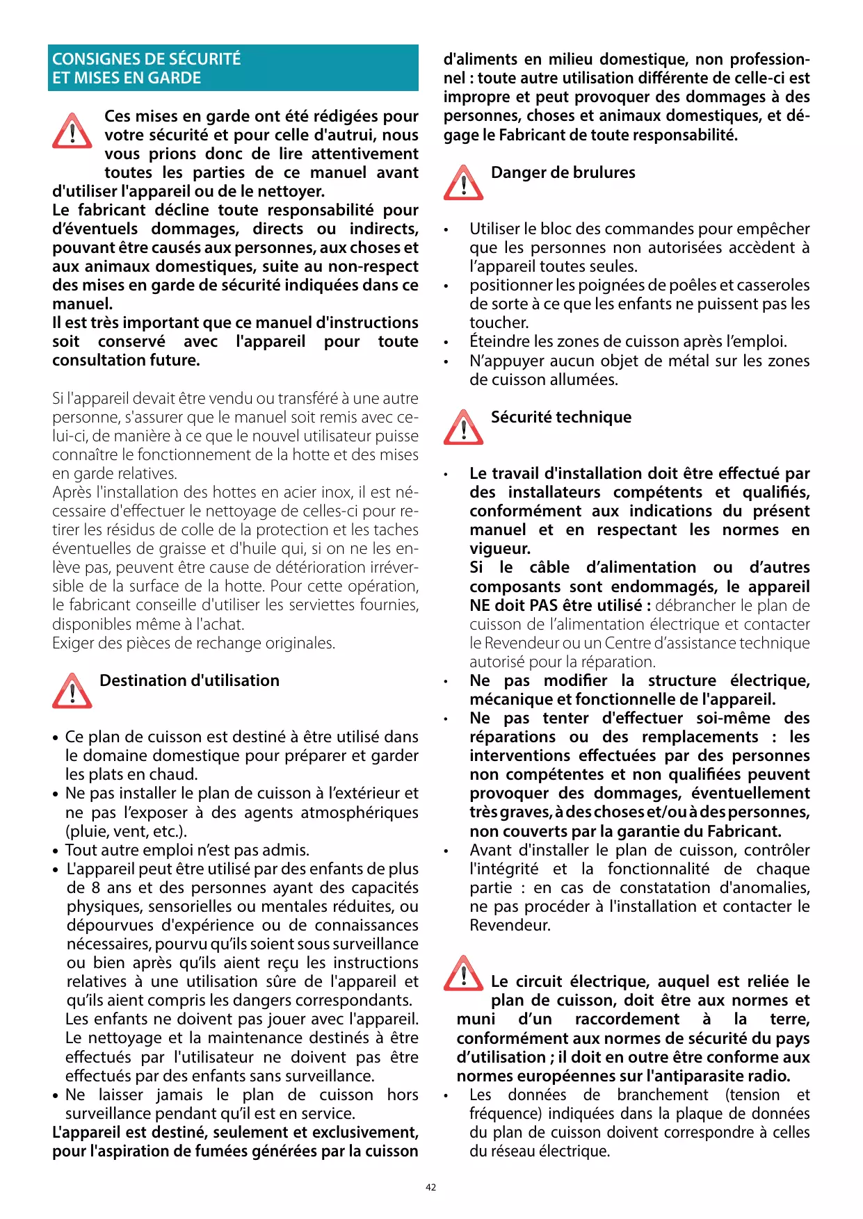 Le fabricant décline toute responsabilité pour d’éventuels dommages, directs ou indirects, pouvant être causés aux personnes, aux choses et aux animaux domestiques, suite au non-respect des mises en garde de sécurité indiquées dans ce manuel. Il est très important que ce manuel d'instructions soit conservé avec l'appareil pour toute consultation future.