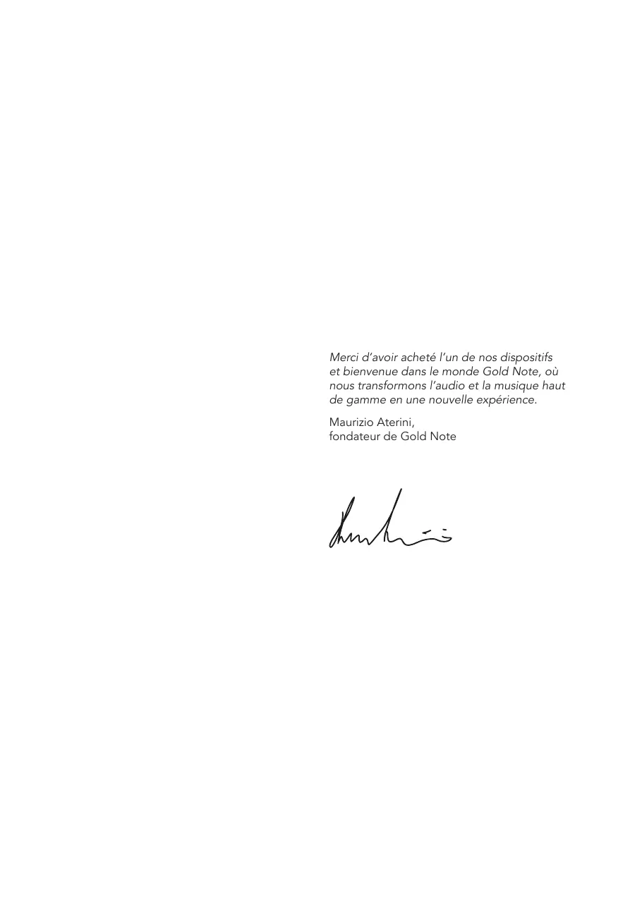 USER MANUAL PH-10 Merci d’avoir acheté l’un de nos dispositifs et bienvenue dans le monde Gold Note, où nous transformons l’audio et la musique haut de gamme en une nouvelle expérience. Maurizio Aterini, fondateur de Gold Note