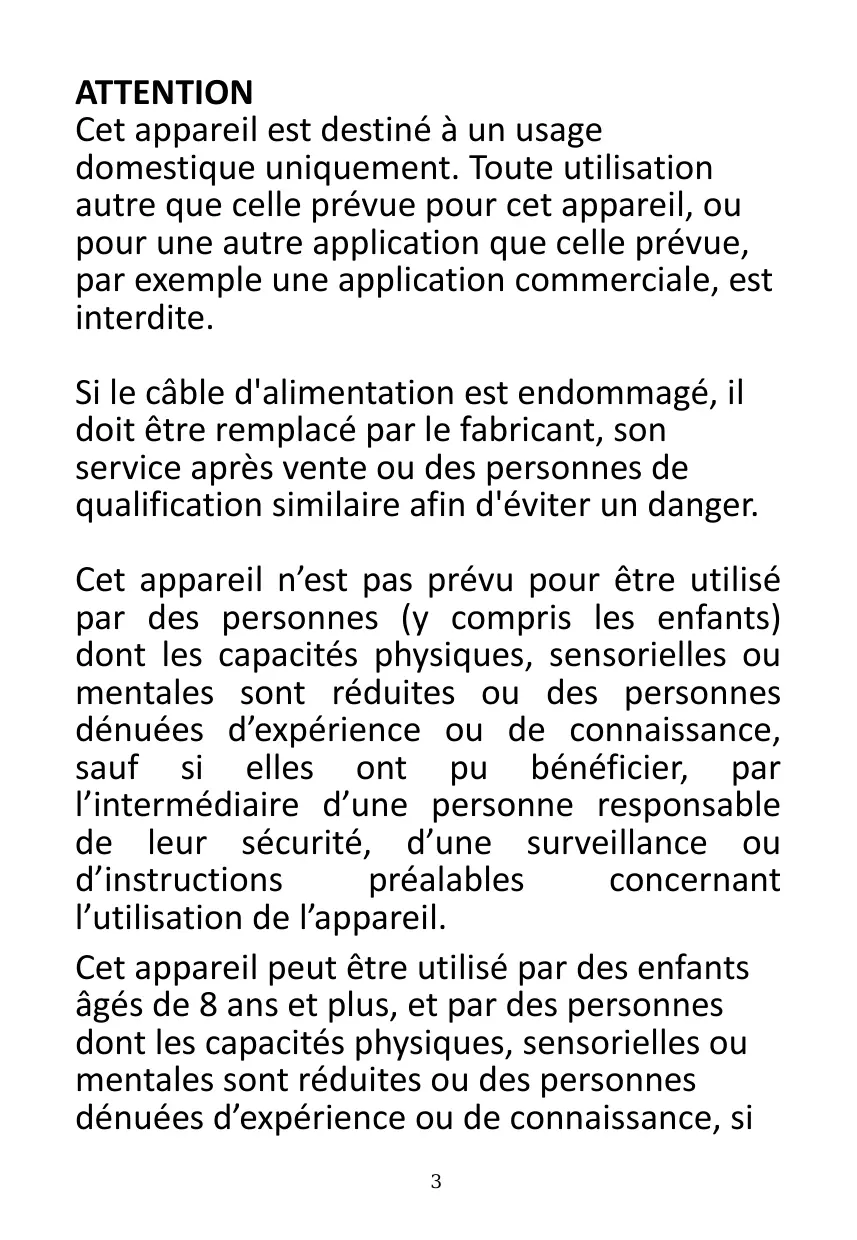 ATTENTION Cet appareil est destiné à un usage domestique uniquement. Toute utilisation autre que celle prévue pour cet appareil, ou pour une autre application que celle prévue, par exemple une application commerciale, est interdite. Si le câble d'alimentation est endommagé, il doit être remplacé par le fabricant, son service après vente ou des personnes de qualification similaire afin d'éviter un danger. Cet appareil n’est pas prévu pour être utilisé par des personnes (y compris les enfants) dont les capacités physiques, sensorielles ou mentales sont réduites ou des personnes dénuées d’expérience ou de connaissance, sauf si elles ont pu bénéficier, par l’intermédiaire d’une personne responsable de leur sécurité, d’une surveillance ou d’instructions préalables concernant l’utilisation de l’appareil. Cet appareil peut être utilisé par des enfants âgés de 8 ans et plus, et par des personnes dont les capacités physiques, sensorielles ou mentales sont réduites ou des personnes dénuées d’expérience ou de connaissance, si