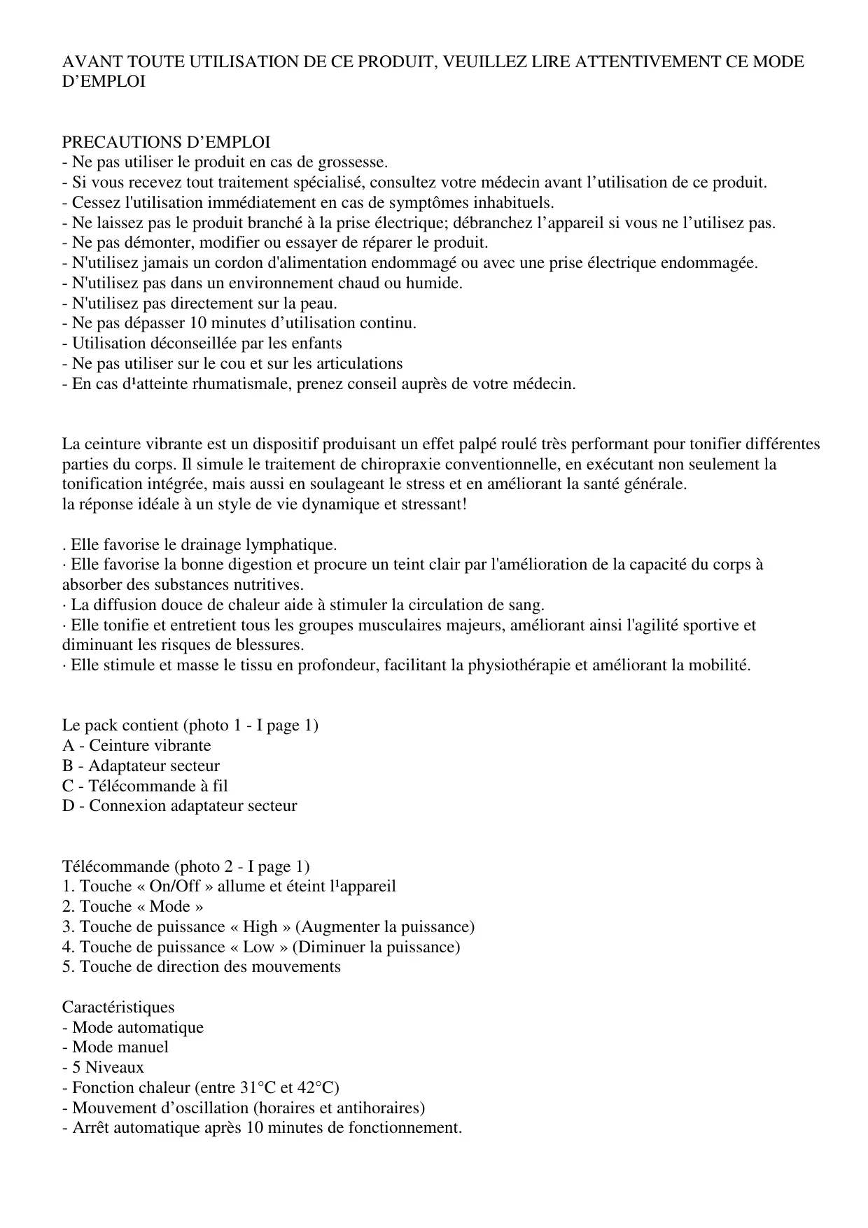 - Ne pas utiliser le produit en cas de grossesse. - Si vous recevez tout traitement spécialisé, consultez votre médecin avant l’utilisation de ce produit. - Cessez l'utilisation immédiatement en cas de symptômes inhabituels. - Ne laissez pas le produit branché à la prise électrique; débranchez l’appareil si vous ne l’utilisez pas. - Ne pas démonter, modifier ou essayer de réparer le produit. - N'utilisez jamais un cordon d'alimentation endommagé ou avec une prise électrique endommagée. - N'utilisez pas dans un environnement chaud ou humide. - N'utilisez pas directement sur la peau. - Ne pas dépasser 10 minutes d’utilisation continu. - Utilisation déconseillée par les enfants - Ne pas utiliser sur le cou et sur les articulations - En cas d¹atteinte rhumatismale, prenez conseil auprès de votre médecin. La ceinture vibrante est un dispositif produisant un effet palpé roulé très performant pour tonifier différentes parties du corps. Il simule le traitement de chiropraxie conventionnelle, en exécutant non seulement la tonification intégrée, mais aussi en soulageant le stress et en améliorant la santé générale. la réponse idéale à un style de vie dynamique et stressant! . Elle favorise le drainage lymphatique.