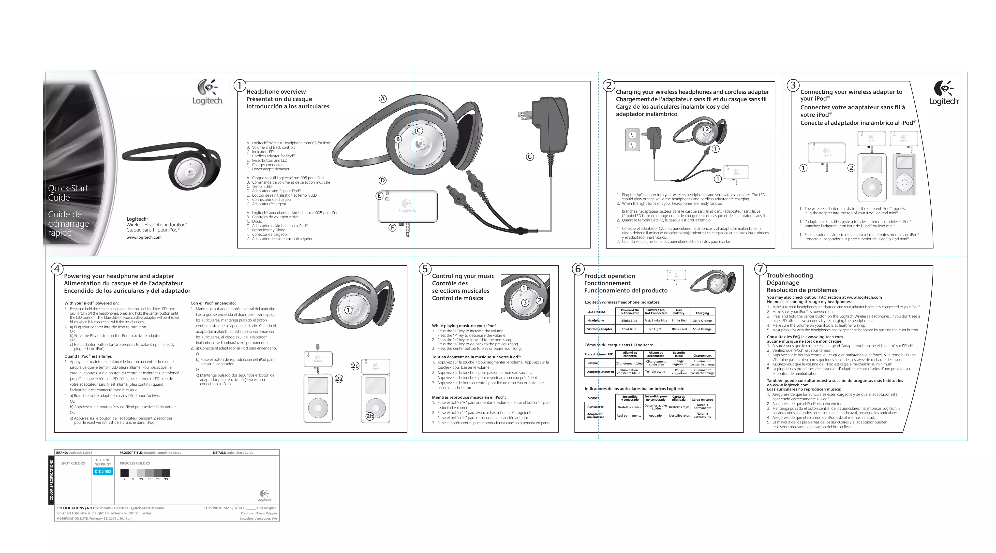 b) Appuyez sur le bouton Play de l’iPod pour activer l’adaptateur. c) Appuyez sur le bouton de l’adaptateur pendant 2 secondes pour le réactiver (s’il est déjà branché dans l’iPod). BRAND: Logitech 1.2005 COLOR SPECIFICATIONS