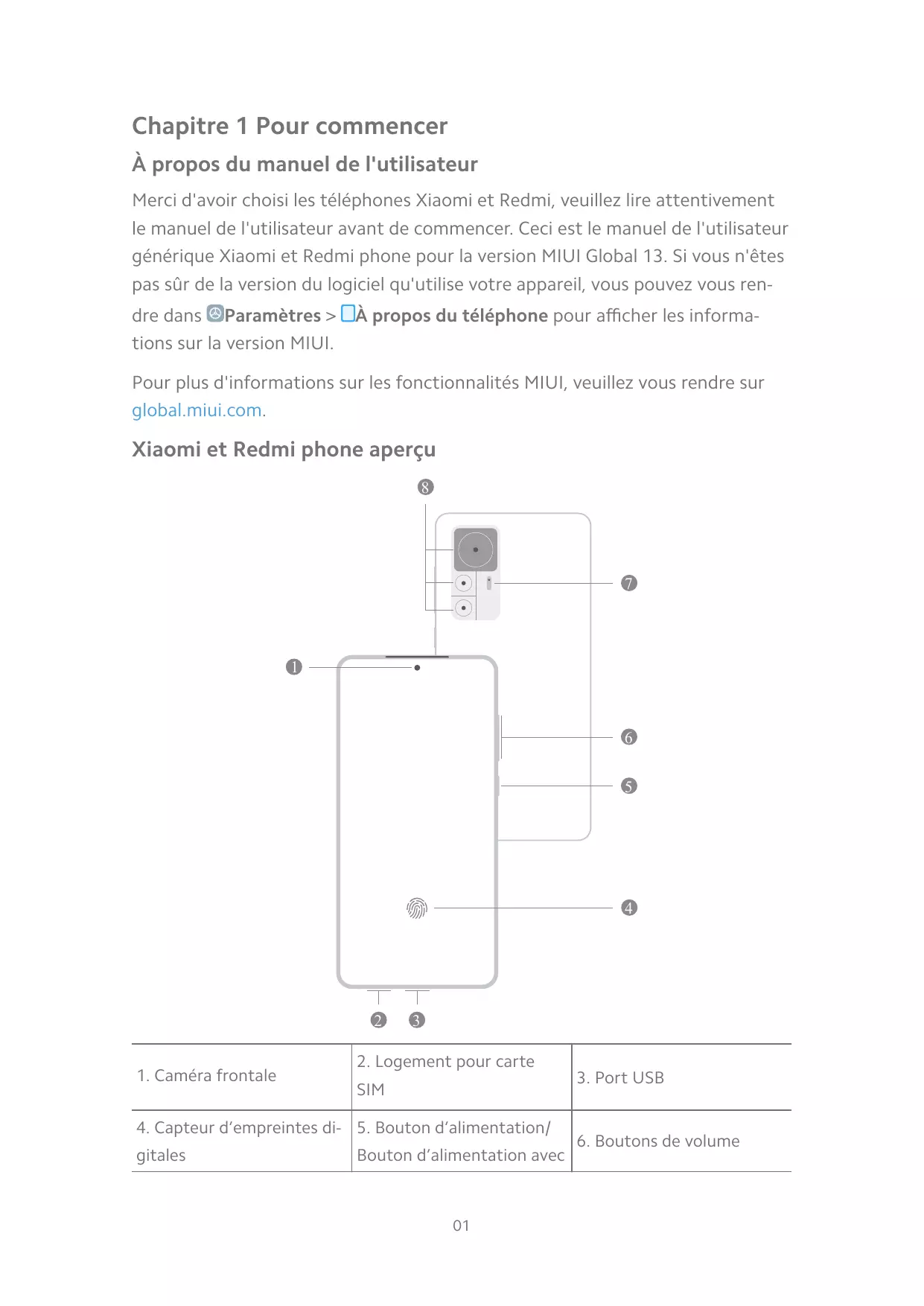 À propos du manuel de l'utilisateur Merci d'avoir choisi les téléphones Xiaomi et Redmi, veuillez lire attentivement le manuel de l'utilisateur avant de commencer. Ceci est le manuel de l'utilisateur générique Xiaomi et Redmi phone pour la version MIUI Global 13. Si vous n'êtes pas sûr de la version du logiciel qu'utilise votre appareil, vous pouvez vous rendre dans Paramètres > tions sur la version MIUI. À propos du téléphone pour afficher les informa- Pour plus d'informations sur les fonctionnalités MIUI, veuillez vous rendre sur global.miui.com. Xiaomi et Redmi phone aperçu