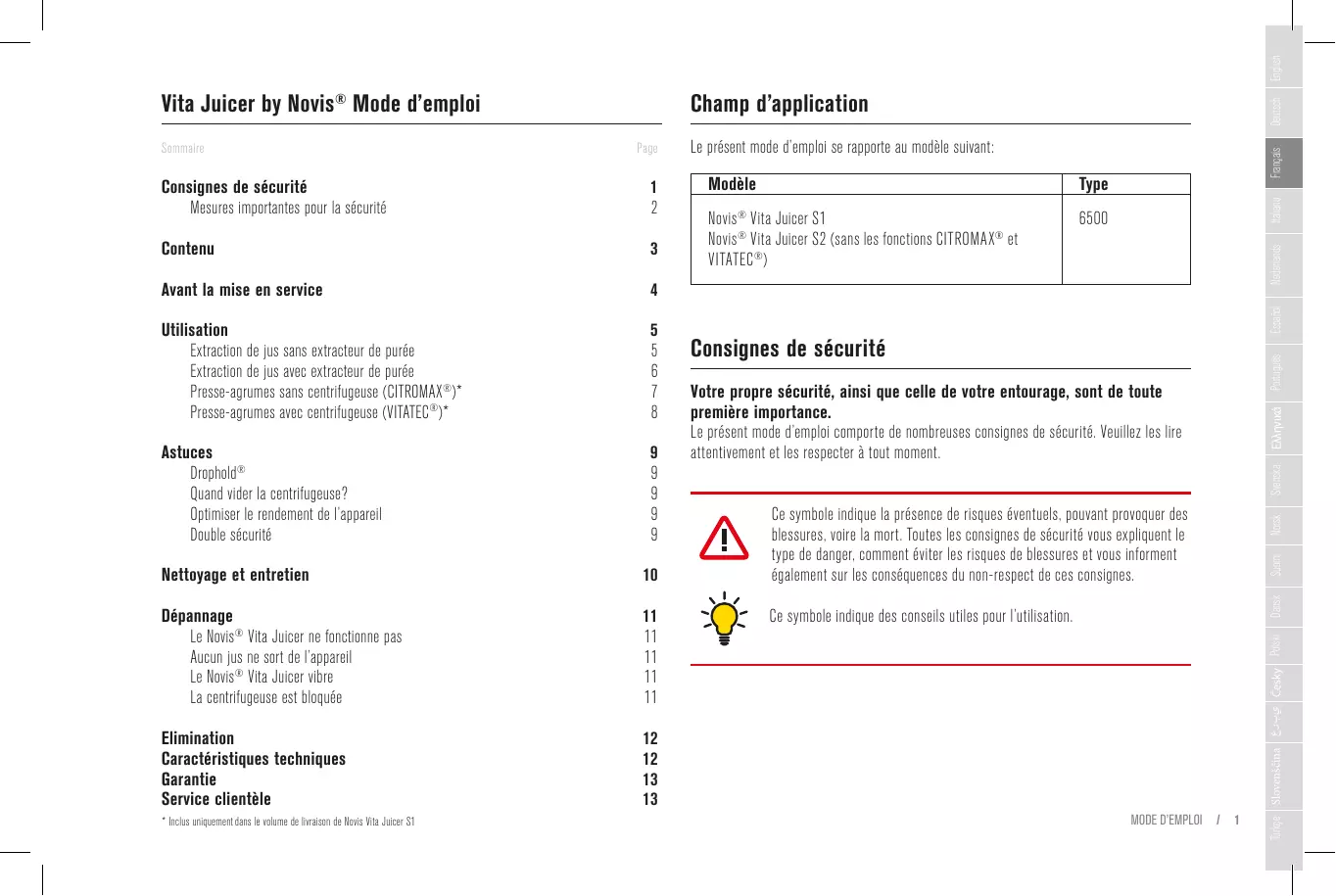 Español Avant la mise en service Novis Vita Juicer S1 Novis ® Vita Juicer S2 (sans les fonctions CITROMAX® et VITATEC ®) Consignes de sécurité Português