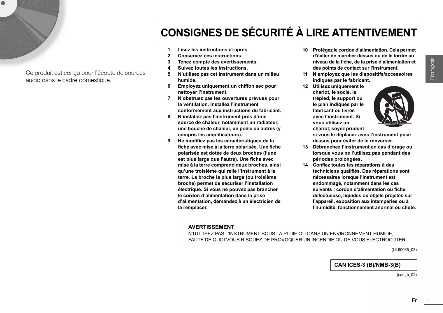 Protégez le cordon d’alimentation. Cela permet d’éviter de marcher dessus ou de le tordre au niveau de la fiche, de la prise d’alimentation et des points de contact sur l’instrument. N’employez que les dispositifs/accessoires indiqués par le fabricant. Utilisez uniquement le chariot, le socle, le trépied, le support ou le plan indiqués par le fabricant ou livrés avec l’instrument. Si vous utilisez un chariot, soyez prudent si vous le déplacez avec l’instrument posé dessus pour éviter de le renverser. Débranchez l’instrument en cas d’orage ou lorsque vous ne l’utilisez pas pendant des périodes prolongées. Confiez toutes les réparations à des techniciens qualifiés. Des réparations sont nécessaires lorsque l’instrument est endommagé, notamment dans les cas suivants : cordon d’alimentation ou fiche défectueuse, liquides ou objets projetés sur l’appareil, exposition aux intempéries ou à l’humidité, fonctionnement anormal ou chute.