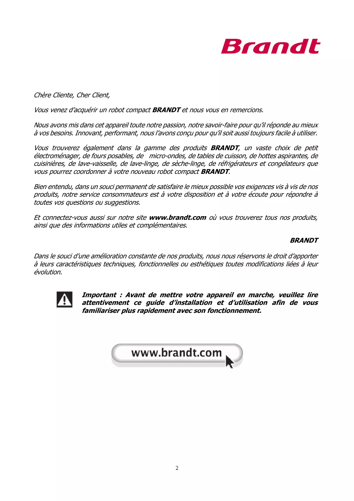 Vousexz d'acquerir un robot compact BRANDT et nous you en remercions.