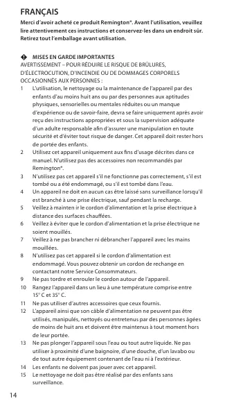 Merc d'avoir acheté ce produit Remington*. Avant l'utilisation, veillez lore attentivement ces instructions et conservez-les dans un endroit s ur. Retireze tout l'emballage avant utilisation.