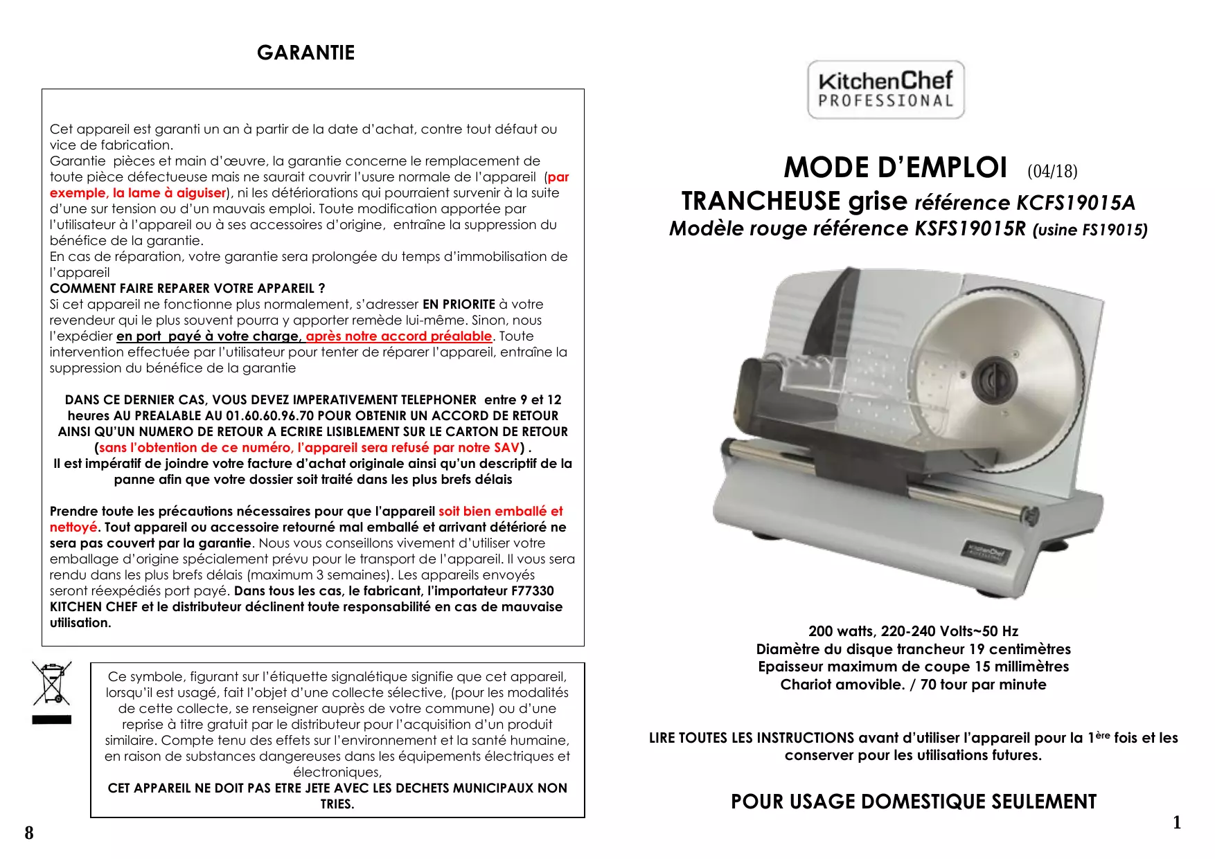 KCFS19015A - Trancheuse KITCHEN CHEF - Notice d'utilisation et mode d'emploi gratuit