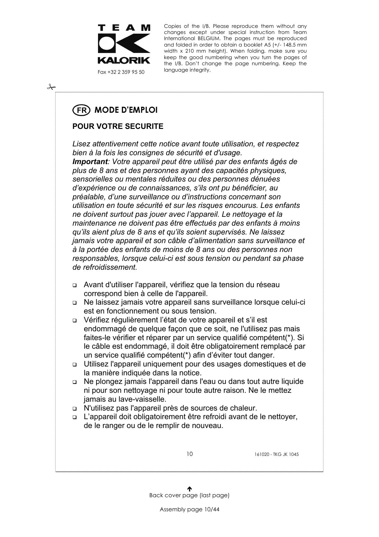 Nous, Team Kalorik Group SA/NV, confirmons par la presente que notre produit correspond aux exigences de la directive 1275/2008/CE. Notre produit n'est pas équipé d'un mode veille, car la bouilloire s'eteint complètement immédiatement après avoir fini de bouillir l'eau et par conséquent ne consomme pas d'énergie électrique!