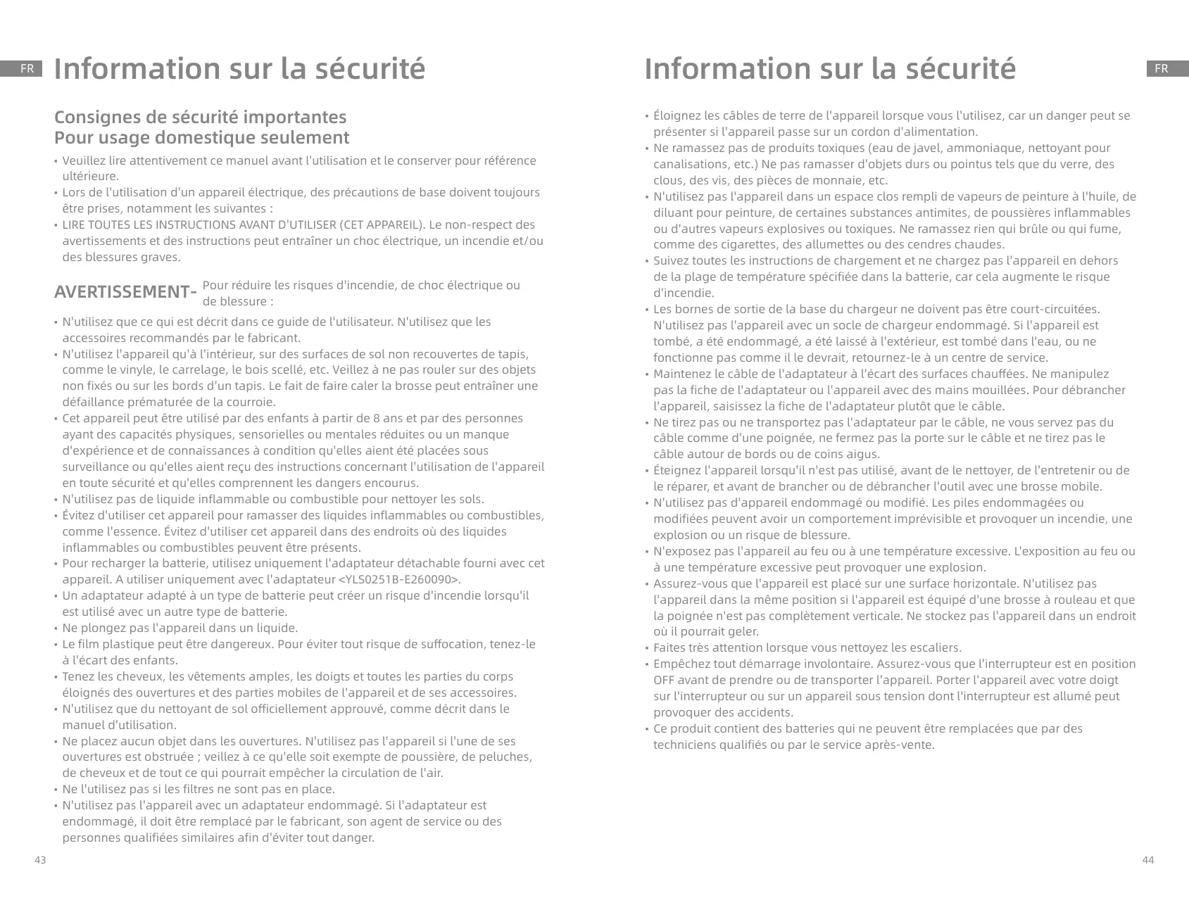- Pour recharger la batterie, utilisez uniquement l'adaptateur détachable fourni avec cet appareil. A utiliser uniquement avec l'adaptateur <YLS0251B-E260090>.
