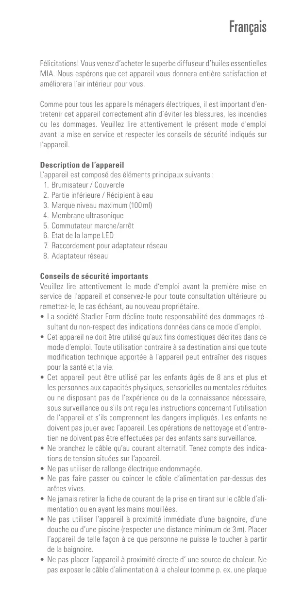 Teilen Sie Ihr Feedback von Mia auf: Share your feedback about Mia on: Partagez votre commentaire sur Mia : www.stadlerform.com/Mia Für häufig gestellte Fragen besuchen Sie: For frequently asked questions go to: Trouvez la foire aux questions sur : www.stadlerform.com/Mia/support Bedienungsanleitung hier herunterladen: Download instruction manual: Téléchargez le mode d’emploi : www.stadlerform.com/Mia/manual Erfahren Sie mehr über das Produkt Mia: Learn more about the product Mia: En savoir plus sur le produit Mia : www.stadlerform.com/Mia Stadler Form Aktiengesellschaft, Chamerstrasse 174, 6300 Zug, Switzerland Phone +41 41 720 48 48, Fax +41 41 720 48 44, www.stadlerform.com/contact Français Félicitations! Vous venez d’acheter le superbe diffuseur d’huiles essentielles MIA. Nous espérons que cet appareil vous donnera entière satisfaction et améliorera l’air intérieur pour vous. Comme pour tous les appareils ménagers électriques, il est important d‘entretenir cet appareil correctement afin d’éviter les blessures, les incendies ou les dommages. Veuillez lire attentivement le présent mode d‘emploi avant la mise en service et respecter les conseils de sécurité indiqués sur l’appareil. Description de l’appareil L’appareil est composé des éléments principaux suivants :