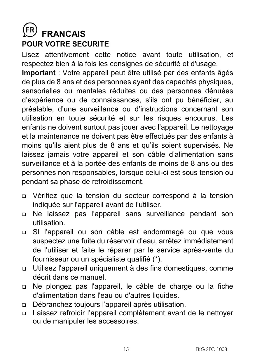 Important : Notre apparéil peut être utilisé par des enfants âgés de plus de 8 ans et des personnes ayant des capacities physiques, sensorielles ou mentales réduites ou des personnes dénuées d'expérience ou de connaissances, s'ils ont pu bénéficier, au préalable, d'une surveillance ou d'instructions concernant son utilisation en toute sécurité et sur les risques encourus. Les enfants ne doivent surtout pas jouer avec l' apparéil. Le nettoyage et la maintenance ne doit pas être effectuels par des enfants à moins qu'ils aient plus de 8 ans et qu'ils soient supervisés. Ne laissez jamais votre apparéil et son cable d'alimentation sans surveillance et à la portée des enfants de moins de 8 ans ou des personnes non responsables, lorsque celui-ci est sous tension ou pendant sa phase de refroidissement.