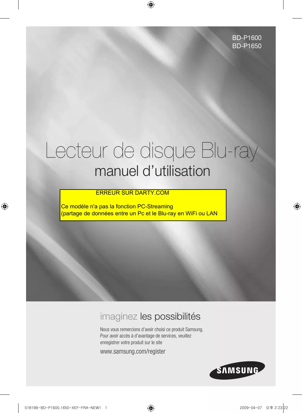 Retrouvez gratuitement la notice de l'appareil BDP-1650 SAMSUNG au format PDF.
