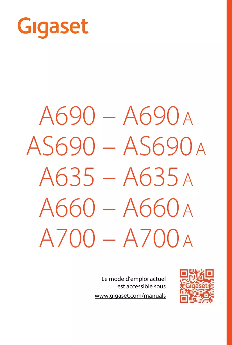 Homologation Cet appareil est destiné au réseau téléphonique analogique français. Les spécificités nationales sont prises en compte. Par la présente, la société Gigaset Communications GmbH déclare que les installations radioélectriques des types suivants sont conformes à la directive 2014/53/UE : Gigaset A690-A690A/AS690-AS690A/A635-A635A/A660-A660A/A700-A700A – Gigaset A690H/AS690H/A635H/A660H/A700H Le texte complet de la déclaration de conformité UE est disponible à l'adresse Internet suivante : www.gigaset.com/docs. Cette déclaration est également disponible dans les fichiers « International Declarations of Conformity » ou « European Declarations of Conformity ». Veuillez consulter ces fichiers.