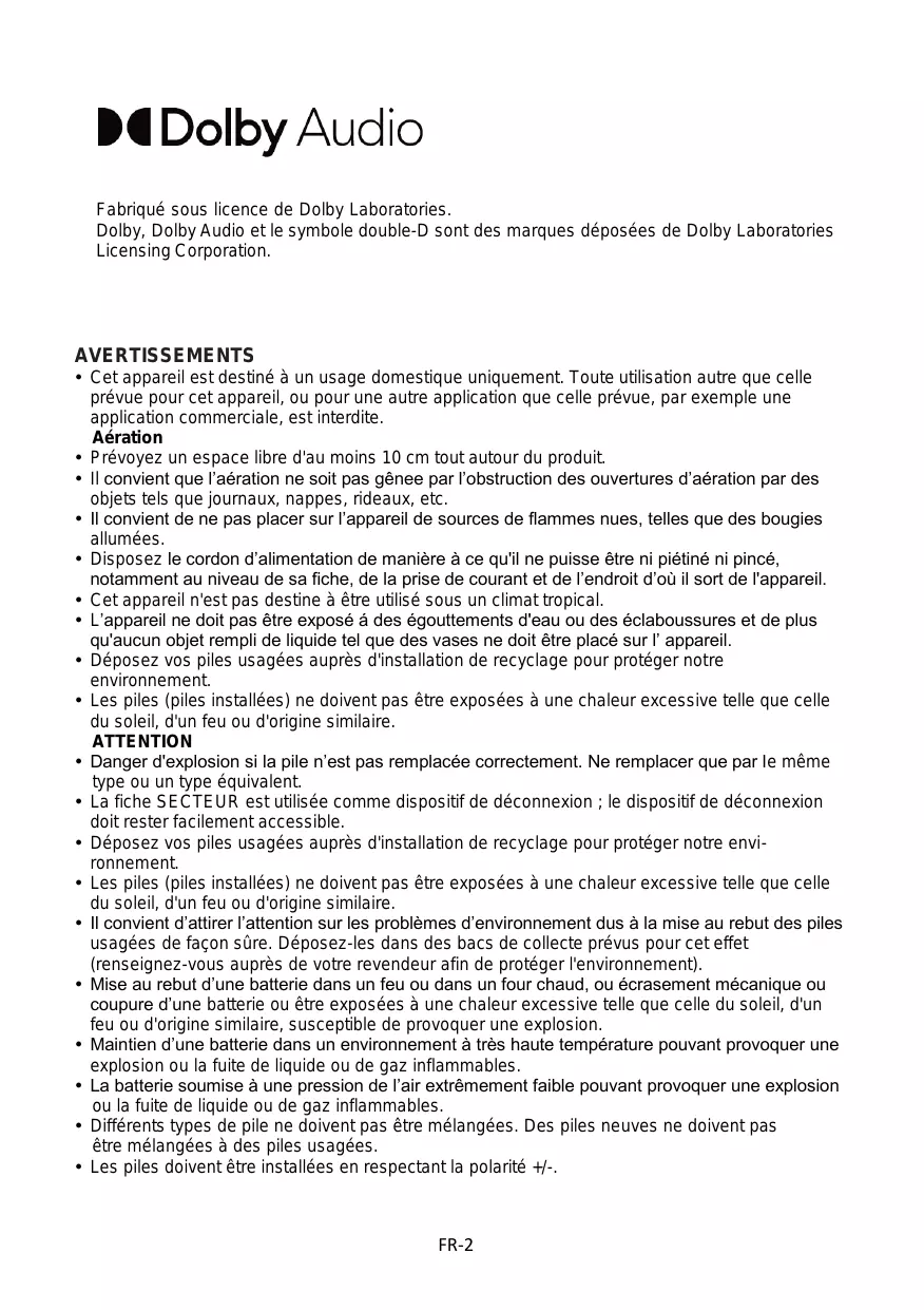 DVB et le logo DVB sont des marques de commerce du projet DVB. Les termes HDMI, interface multimédia haute définition HDMI et habillage commercial HDMI, et les logos HDMI sont des marques commerciales et des marques déposées de HDMI Licensing Administrator, Inc. FR-1 Fabriqué sous licence de Dolby Laboratories. Dolby, Dolby Audio et le symbole double-D sont des marques déposées de Dolby Laboratories Licensing Corporation. AVERTISSEMENTS Cet appareil est destiné à un usage domestique uniquement. Toute utilisation autre que celle prévue pour cet appareil, ou pour une autre application que celle prévue, par exemple une application commerciale, est interdite. Aération Prévoyez un espace libre d'au moins 10 cm tout autour du produit. Il convient que l’aération ne soit pas gênee par l’obstruction des ouvertures d’aération par des objets tels que journaux, nappes, rideaux, etc. Il convient de ne pas placer sur l’appareil de sources de flammes nues, telles que des bougies allumées. Disposez le cordon d’alimentation de manière à ce qu'il ne puisse être ni piétiné ni pincé, notamment au niveau de sa fiche, de la prise de courant et de l’endroit d’où il sort de l'appareil. Cet appareil n'est pas destine à être utilisé sous un climat tropical. L’appareil ne doit pas être exposé á des égouttements d'eau ou des éclaboussures et de plus qu'aucun objet rempli de liquide tel que des vases ne doit être placé sur l’ appareil. Déposez vos piles usagées auprès d'installation de recyclage pour protéger notre environnement. Les piles (piles installées) ne doivent pas être exposées à une chaleur excessive telle que celle du soleil, d'un feu ou d'origine similaire. ATTENTION Danger d'explosion si la pile n’est pas remplacée correctement. Ne remplacer que par le même type ou un type équivalent. La fiche SECTEUR est utilisée comme dispositif de déconnexion ; le dispositif de déconnexion doit rester facilement accessible. Déposez vos piles usagées auprès d'installation de recyclage pour protéger notre environnement. Les piles (piles installées) ne doivent pas être exposées à une chaleur excessive telle que celle du soleil, d'un feu ou d'origine similaire. Il convient d’attirer l’attention sur les problèmes d’environnement dus à la mise au rebut des piles usagées de façon sûre. Déposez-les dans des bacs de collecte prévus pour cet effet (renseignez-vous auprès de votre revendeur afin de protéger l'environnement). Mise au rebut d’une batterie dans un feu ou dans un four chaud, ou écrasement mécanique ou coupure d’une batterie ou être exposées à une chaleur excessive telle que celle du soleil, d'un feu ou d'origine similaire, susceptible de provoquer une explosion. Maintien d’une batterie dans un environnement à très haute température pouvant provoquer une explosion ou la fuite de liquide ou de gaz inflammables. La batterie soumise à une pression de l’air extrêmement faible pouvant provoquer une explosion ou la fuite de liquide ou de gaz inflammables. Différents types de pile ne doivent pas être mélangées. Des piles neuves ne doivent pas être mélangées à des piles usagées. Les piles doivent être installées en respectant la polarité +/-. FR-2 Les piles usagées doivent être enlevées de l'appareil. Ne pas court-circuiter les piles.