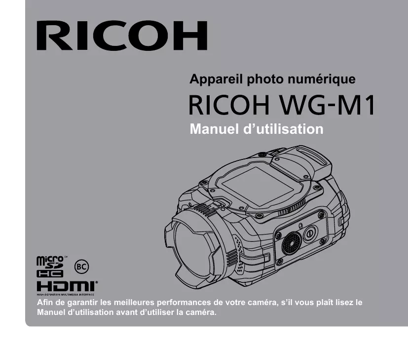Appareil photo numérique Manuel d’utilisation Ain de garantir les meilleures performances de votre caméra, s’il vous plaît lisez le Manuel d’utilisation avant d’utiliser la caméra. Merci d’avoir fait l’acquisition de cet appareil RICOH WG-M1. Veuillez lire le mode d’emploi préalablement à l’utilisation de l’appareil ain de tirer le meilleur parti des fonctions de ce produit. Ce document, qui est à conserver après lecture, sera un outil précieux pour vous aider à comprendre l’ensemble des caractéristiques de l’appareil. Droits d’auteur Les images prises à l’aide du RICOH WG-M1 destinées à un usage autre que privé ne peuvent être utilisées sans autorisation préalable, tel que déini par le Copyright Act (législation relative aux droits d’auteur en vigueur aux États-Unis). Soyez particulièrement attentif aux restrictions concernant l’usage privé de certains types d’images, prises lors de manifestations ou de spectacles ou destinées à être exposées. Les images prises dans le but d’obtenir des droits d’auteur ne peuvent être utilisées autrement que dans le cadre des droits d’auteur déinis par le Copyright Act, et une vigilance particulière est également recommandée à cet égard. Marques déposées