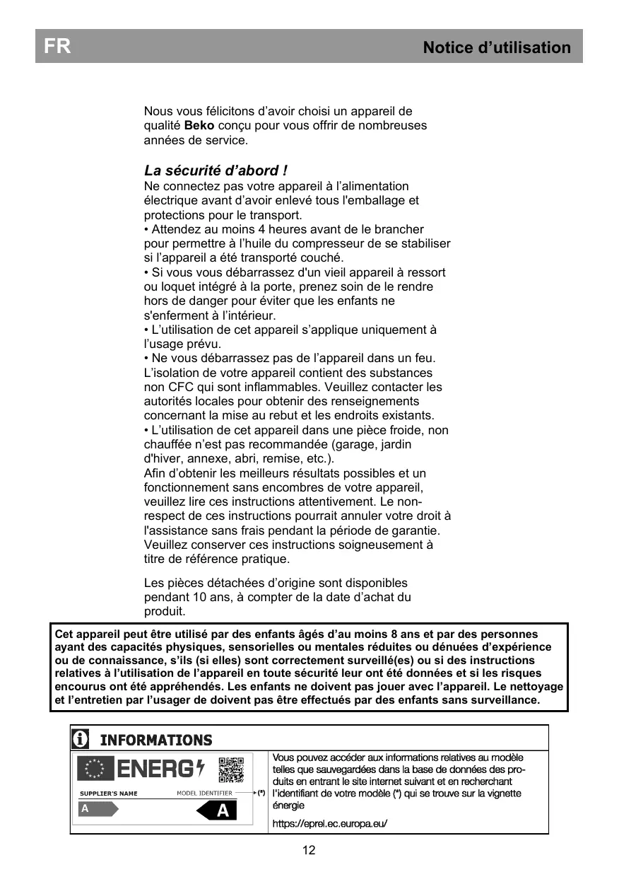 Ne connectez pas votre appareil à l’alimentation électrique avant d’avoir enlevé tous l'emballage et protections pour le transport. • Attendez au moins 4 heures avant de le brancher pour permettre à l’huile du compresseur de se stabiliser si l’appareil a été transporté couché. • Si vous vous débarrassez d'un vieil appareil à ressort ou loquet intégré à la porte, prenez soin de le rendre hors de danger pour éviter que les enfants ne s'enferment à l’intérieur. • L’utilisation de cet appareil s’applique uniquement à l’usage prévu. • Ne vous débarrassez pas de l’appareil dans un feu. L’isolation de votre appareil contient des substances non CFC qui sont inflammables. Veuillez contacter les autorités locales pour obtenir des renseignements concernant la mise au rebut et les endroits existants. • L’utilisation de cet appareil dans une pièce froide, non chauffée n’est pas recommandée (garage, jardin d'hiver, annexe, abri, remise, etc.). Afin d’obtenir les meilleurs résultats possibles et un fonctionnement sans encombres de votre appareil, veuillez lire ces instructions attentivement. Le nonrespect de ces instructions pourrait annuler votre droit à l'assistance sans frais pendant la période de garantie. Veuillez conserver ces instructions soigneusement à titre de référence pratique. Les pièces détachées d’origine sont disponibles pendant 10 ans, à compter de la date d’achat du produit. Cet appareil peut être utilisé par des enfants âgés d’au moins 8 ans et par des personnes ayant des capacités physiques, sensorielles ou mentales réduites ou dénuées d’expérience ou de connaissance, s’ils (si elles) sont correctement surveillé(es) ou si des instructions relatives à l’utilisation de l’appareil en toute sécurité leur ont été données et si les risques encourus ont été appréhendés. Les enfants ne doivent pas jouer avec l’appareil. Le nettoyage et l’entretien par l’usager de doivent pas être effectués par des enfants sans surveillance.