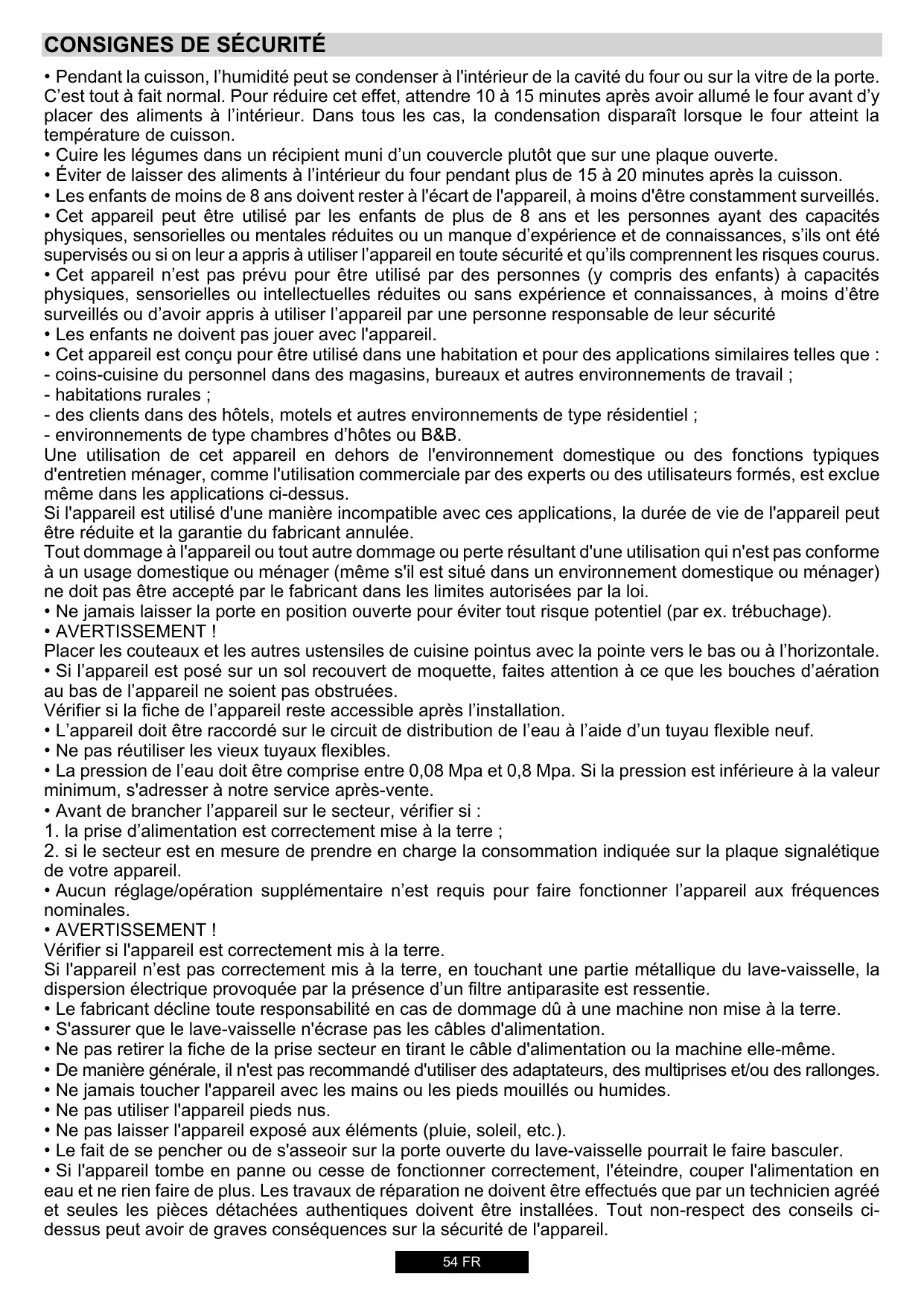 53 DE CONSIGNES DE SÉCURITÉ • Pendant la cuisson, l’humidité peut se condenser à l'intérieur de la cavité du four ou sur la vitre de la porte. C’est tout à fait normal. Pour réduire cet effet, attendre 10 à 15 minutes après avoir allumé le four avant d’y placer des aliments à l’intérieur. Dans tous les cas, la condensation disparaît lorsque le four atteint la température de cuisson. • Cuire les légumes dans un récipient muni d’un couvercle plutôt que sur une plaque ouverte. • Éviter de laisser des aliments à l’intérieur du four pendant plus de 15 à 20 minutes après la cuisson. • Les enfants de moins de 8 ans doivent rester à l'écart de l'appareil, à moins d'être constamment surveillés. • Cet appareil peut être utilisé par les enfants de plus de 8 ans et les personnes ayant des capacités physiques, sensorielles ou mentales réduites ou un manque d’expérience et de connaissances, s’ils ont été supervisés ou si on leur a appris à utiliser l’appareil en toute sécurité et qu’ils comprennent les risques courus. • Cet appareil n’est pas prévu pour être utilisé par des personnes (y compris des enfants) à capacités physiques, sensorielles ou intellectuelles réduites ou sans expérience et connaissances, à moins d’être surveillés ou d’avoir appris à utiliser l’appareil par une personne responsable de leur sécurité • Les enfants ne doivent pas jouer avec l'appareil. • Cet appareil est conçu pour être utilisé dans une habitation et pour des applications similaires telles que : - coins-cuisine du personnel dans des magasins, bureaux et autres environnements de travail ; - habitations rurales ; - des clients dans des hôtels, motels et autres environnements de type résidentiel ; - environnements de type chambres d’hôtes ou B&B. Une utilisation de cet appareil en dehors de l'environnement domestique ou des fonctions typiques d'entretien ménager, comme l'utilisation commerciale par des experts ou des utilisateurs formés, est exclue même dans les applications ci-dessus. Si l'appareil est utilisé d'une manière incompatible avec ces applications, la durée de vie de l'appareil peut être réduite et la garantie du fabricant annulée. Tout dommage à l'appareil ou tout autre dommage ou perte résultant d'une utilisation qui n'est pas conforme à un usage domestique ou ménager (même s'il est situé dans un environnement domestique ou ménager) ne doit pas être accepté par le fabricant dans les limites autorisées par la loi. • Ne jamais laisser la porte en position ouverte pour éviter tout risque potentiel (par ex. trébuchage). • AVERTISSEMENT ! Placer les couteaux et les autres ustensiles de cuisine pointus avec la pointe vers le bas ou à l’horizontale. • Si l’appareil est posé sur un sol recouvert de moquette, faites attention à ce que les bouches d’aération au bas de l’appareil ne soient pas obstruées. Vérifier si la fiche de l’appareil reste accessible après l’installation. • L’appareil doit être raccordé sur le circuit de distribution de l’eau à l’aide d’un tuyau flexible neuf. • Ne pas réutiliser les vieux tuyaux flexibles. • La pression de l’eau doit être comprise entre 0,08 Mpa et 0,8 Mpa. Si la pression est inférieure à la valeur minimum, s'adresser à notre service après-vente. • Avant de brancher l’appareil sur le secteur, vérifier si : 1. la prise d’alimentation est correctement mise à la terre ; 2. si le secteur est en mesure de prendre en charge la consommation indiquée sur la plaque signalétique de votre appareil. • Aucun réglage/opération supplémentaire n’est requis pour faire fonctionner l’appareil aux fréquences nominales. • AVERTISSEMENT ! Vérifier si l'appareil est correctement mis à la terre. Si l'appareil n’est pas correctement mis à la terre, en touchant une partie métallique du lave-vaisselle, la dispersion électrique provoquée par la présence d’un filtre antiparasite est ressentie. • Le fabricant décline toute responsabilité en cas de dommage dû à une machine non mise à la terre. • S'assurer que le lave-vaisselle n'écrase pas les câbles d'alimentation. • Ne pas retirer la fiche de la prise secteur en tirant le câble d'alimentation ou la machine elle-même. • De manière générale, il n'est pas recommandé d'utiliser des adaptateurs, des multiprises et/ou des rallonges. • Ne jamais toucher l'appareil avec les mains ou les pieds mouillés ou humides. • Ne pas utiliser l'appareil pieds nus. • Ne pas laisser l'appareil exposé aux éléments (pluie, soleil, etc.). • Le fait de se pencher ou de s'asseoir sur la porte ouverte du lave-vaisselle pourrait le faire basculer. • Si l'appareil tombe en panne ou cesse de fonctionner correctement, l'éteindre, couper l'alimentation en eau et ne rien faire de plus. Les travaux de réparation ne doivent être effectués que par un technicien agréé et seules les pièces détachées authentiques doivent être installées. Tout non-respect des conseils cidessus peut avoir de graves conséquences sur la sécurité de l'appareil.