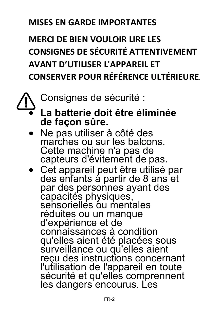 Cette machine n'a pas de capteurs d'évitement de pas. • Cet appareil peut être utilisé par des enfants à partir de 8 ans et par des personnes ayant des capacités physiques, sensorielles ou mentales réduites ou un manque d'expérience et de connaissances à condition qu'elles aient été placées sous surveillance ou qu'elles aient reçu des instructions concernant l'utilisation de l'appareil en toute sécurité et qu'elles comprennent les dangers encourus. Les FR-2