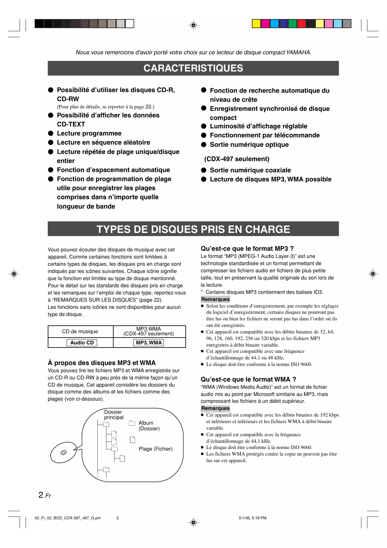 6/1/06, 9:15 PM Nous vous remercions d’avoir porté votre choix sur ce lecteur de disque compact YAMAHA. CARACTERISTIQUES 䢇 Possibilité d’utiliser les disques CD-R, CD-RW (Pour plus de détails, se reporter à la page 22.) 䢇 Possibilité d’afficher les données CD-TEXT 䢇 Lecture programmee 䢇 Lecture en séquence aléatoire 䢇 Lecture répétée de plage unique/disque entier 䢇 Fonction d’espacement automatique 䢇 Fonction de programmation de plage utile pour enregistrer les plages comprises dans n’importe quelle longueur de bande 䢇 Fonction de recherche automatique du niveau de crête 䢇 Enregistrement synchronisé de disque compact 䢇 Luminosité d’affichage réglable 䢇 Fonctionnement par télécommande 䢇 Sortie numérique optique (CDX-497 seulement) 䢇 Sortie numérique coaxiale 䢇 Lecture de disques MP3, WMA possible