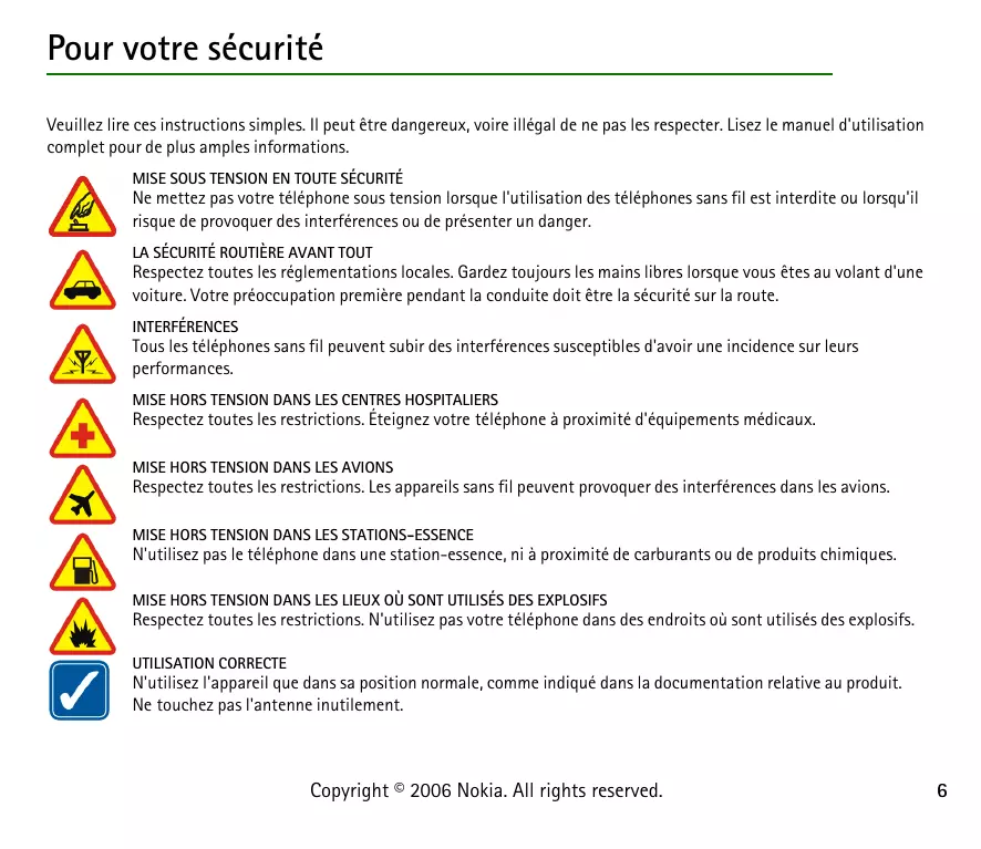 ■ Appareils médicaux Les équipements de transmission par fréquences radioélectriques, y compris les téléphones sans fil, peuvent entrer en interférence avec les appareils médicaux mal protégés. Consultez un médecin ou le constructeur de l'appareil médical pour déterminer s'ils sont protégés correctement des signaux de fréquences radioélectriques externes ou si vous avez des questions. Éteignez votre appareil dans les centres de soins médicaux où des inscriptions en interdisent l'utilisation. Les centres hospitaliers ou de santé peuvent utiliser des équipements sensibles aux signaux de fréquences radioélectriques externes. Copyright © 2006 Nokia. All rights reserved.
