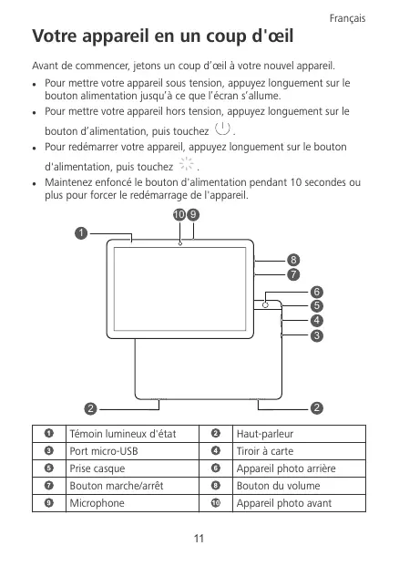 Allez à Astuces pour plus de détails sur la fonction et de conseils d'utilisation. l Visitez http://consumer.huawei.com/en pour consulter les informations sur l'appareil, les questions fréquentes et autres informations. l Vous rendre sur le site http://consumer.huawei.com/en/support pour connaître les coordonnées de contact les plus récentes pour votre pays ou région. l Vous pouvez trouver les services d'assistance téléphonique, les adresses des points de vente, la politique de service et plus d'informations pour votre région dans HiCare. Accédez à Paramètres puis touchez Système > À propos de la tablette > Légal pour consulter les informations juridiques relatives à votre produit. Accédez à Paramètres puis touchez Système > À propos de la tablette > Légal > Informations de sécurité pour consulter les informations de sécurité relatives à votre produit. Accédez à Paramètres puis touchez Système > À propos de la tablette > Information d'authentification pour consulter les informations réglementaires relatives à votre produit. Accédez à Paramètres puis touchez Système > Logos de certification pour plus d’informations relatives aux marques de certifications pour votre produit. Toutes les images et illustrations figurant dans ce guide, notamment la couleur et la taille de l'appareil, ainsi que le contenu de l'affichage, sont fournies à titre de référence uniquement. Il est possible que l'appareil réel diffère. Rien dans ce guide ne constitue une quelconque garantie, explicite ou implicite.