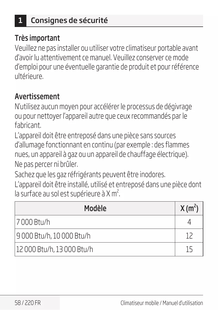 Très important Veuillez ne pas installer ou utiliser votre climatiseur portable avant d’avoir lu attentivement ce manuel. Veuillez conserver ce mode d’emploi pour une éventuelle garantie de produit et pour référence ultérieure. Avertissement N’utilisez aucun moyen pour accélérer le processus de dégivrage ou pour nettoyer l’appareil autre que ceux recommandés par le fabricant. L’appareil doit être entreposé dans une pièce sans sources d’allumage fonctionnant en continu (par exemple : des flammes nues, un appareil à gaz ou un appareil de chauffage électrique). Ne pas percer ni brûler. Sachez que les gaz réfrigérants peuvent être inodores. L’appareil doit être installé, utilisé et entreposé dans une pièce dont la surface au sol est supérieure à X m2. Modèle