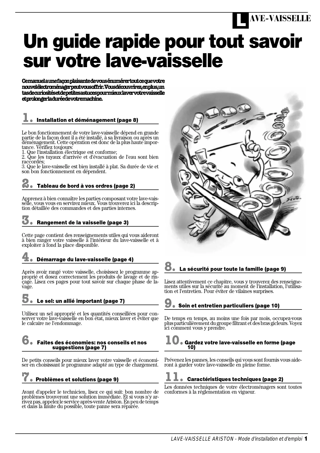 Les données techniques de votre électroménagers sont toutes Avant d'appeler le technicien, lisez ce qui suit: bon nombre de conformes à la réglementation en vigueur. problèmes trouveront une solution immédiate. Et si vous n'y arrivez pas, appelez le service après-vente Ariston. En peu de temps et dans la limite du possible, toute panne sera réparée. LAVE-VAISSELLE ARISTON - Mode d'installation et d'emploi 1 L AVE-VAISSELLE Ouvrons ensemble votre lave-vaisselle Qu'est-ce qu'il contient?