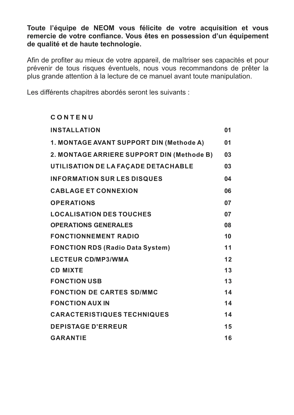 Toute l'equipe de NEOM vous félicite de votre acquisition et vous remercience de votre confiance. Vous étés en possession d'un équipement de qualité et de haute technologie.