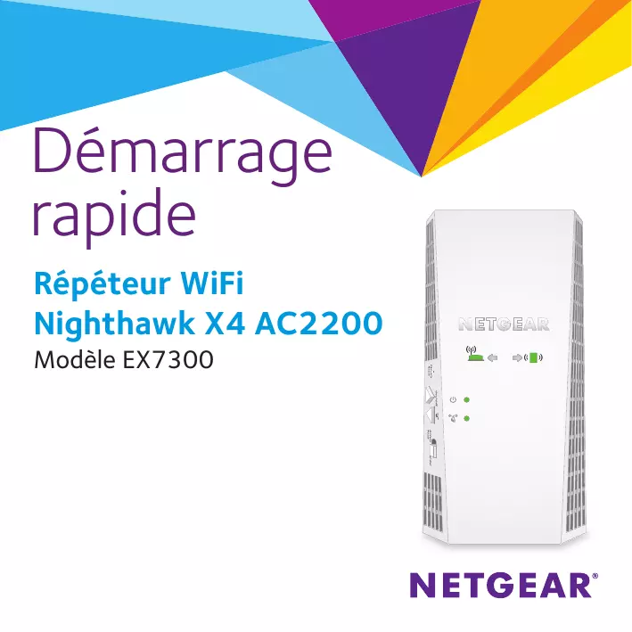 Démarrage rapide Répéteur WiFi Nighthawk X4 AC2200 Modèle EX7300 Démarrage Le répéteur WiFi NETGEAR augmente la portée d'un réseau WiFi en renforçant le signal WiFi existant et sa qualité globale sur de longues distances. Un répéteur répète les signaux émis par un routeur ou point d'accès WiFi existant. Répéteur WiFi Etend la portée de votre réseau WiFi existant et crée un signal plus fort dans les zones difficiles à atteindre. Réseau WiFi existant Parfois, la couverture WiFi de votre routeur n'est pas suffisante pour répondre à vos besoins.