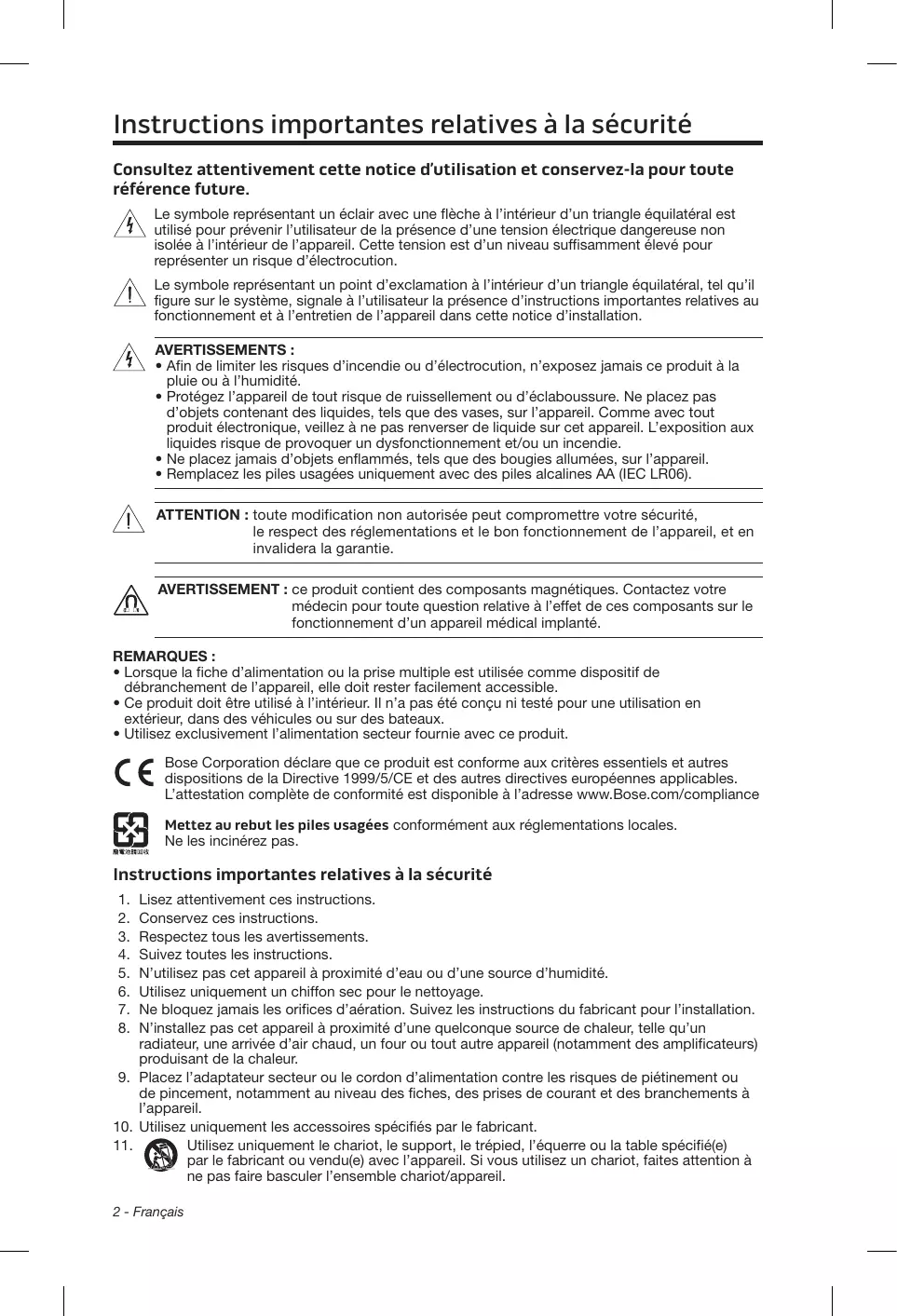 - Utilisez exclusivement l’alimentation secteur fournie avec ce produit. ose Corporation déclare que ce produit est conforme aux critères essentiels et autres dispositions de la Directive 1999/5/CE et des autres directives européennes applicables. L’attestation complète de conformité est disponible à l’adresse www.Bose.com/compliance