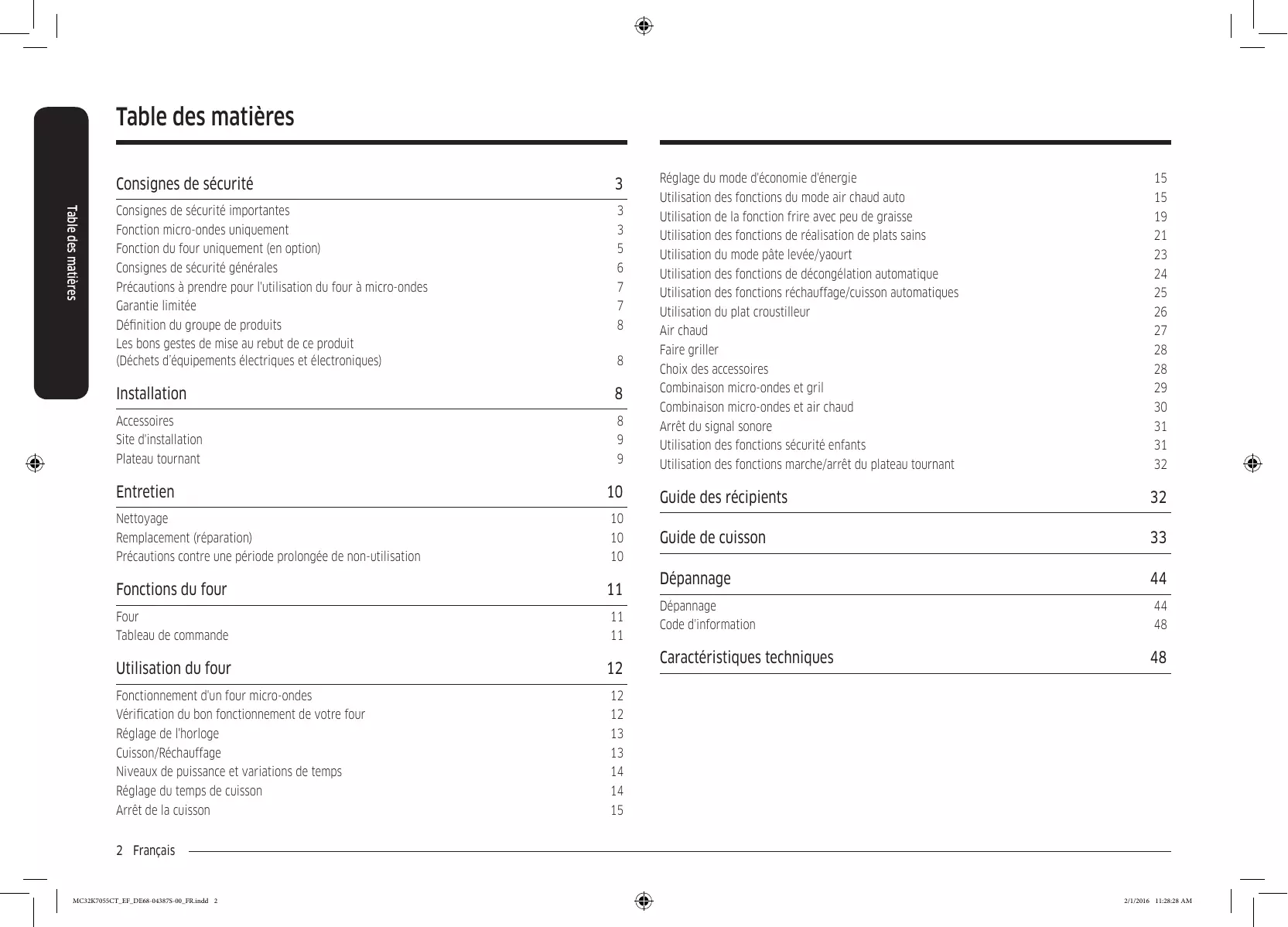 • La durée de cuisson maximale est de 60 minutes. (Mode Combiné Microondes et Air chaud) (Puissance de sortie) 30 Français MC32K7055CT_EF_DE68-04387S-00_FR.indd 30 2/1/2016 11:28:37 AM