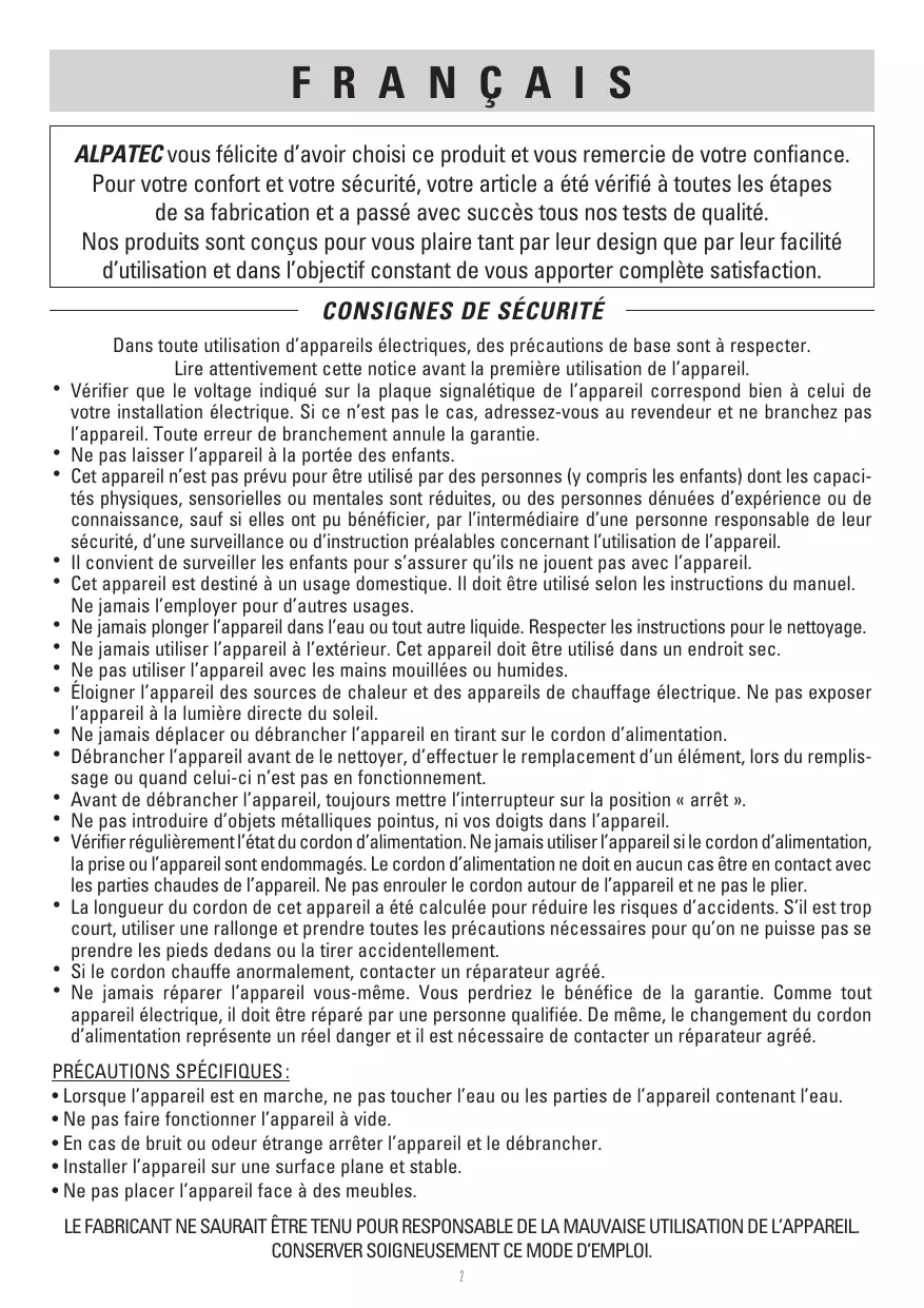 Dans toute utilisation d’appareils électriques, des précautions de base sont à respecter. Lire attentivement cette notice avant la première utilisation de l’appareil. Vérifier que le voltage indiqué sur la plaque signalétique de l’appareil correspond bien à celui de votre installation électrique. Si ce n’est pas le cas, adressez-vous au revendeur et ne branchez pas l’appareil. Toute erreur de branchement annule la garantie. Ne pas laisser l’appareil à la portée des enfants. Cet appareil n’est pas prévu pour être utilisé par des personnes (y compris les enfants) dont les capacités physiques, sensorielles ou mentales sont réduites, ou des personnes dénuées d’expérience ou de connaissance, sauf si elles ont pu bénéficier, par l’intermédiaire d’une personne responsable de leur sécurité, d’une surveillance ou d’instruction préalables concernant l’utilisation de l’appareil. Il convient de surveiller les enfants pour s’assurer qu’ils ne jouent pas avec l’appareil. Cet appareil est destiné à un usage domestique. Il doit être utilisé selon les instructions du manuel. Ne jamais l’employer pour d’autres usages. Ne jamais plonger l’appareil dans l’eau ou tout autre liquide. Respecter les instructions pour le nettoyage. Ne jamais utiliser l’appareil à l’extérieur. Cet appareil doit être utilisé dans un endroit sec. Ne pas utiliser l’appareil avec les mains mouillées ou humides. Éloigner l’appareil des sources de chaleur et des appareils de chauffage électrique. Ne pas exposer l’appareil à la lumière directe du soleil. Ne jamais déplacer ou débrancher l’appareil en tirant sur le cordon d’alimentation. Débrancher l’appareil avant de le nettoyer, d’effectuer le remplacement d’un élément, lors du remplissage ou quand celui-ci n’est pas en fonctionnement. Avant de débrancher l’appareil, toujours mettre l’interrupteur sur la position « arrêt ». Ne pas introduire d’objets métalliques pointus, ni vos doigts dans l’appareil. Vérifier régulièrement l’état du cordon d’alimentation. Ne jamais utiliser l’appareil si le cordon d’alimentation, la prise ou l’appareil sont endommagés. Le cordon d’alimentation ne doit en aucun cas être en contact avec les parties chaudes de l’appareil. Ne pas enrouler le cordon autour de l’appareil et ne pas le plier. La longueur du cordon de cet appareil a été calculée pour réduire les risques d’accidents. S’il est trop court, utiliser une rallonge et prendre toutes les précautions nécessaires pour qu’on ne puisse pas se prendre les pieds dedans ou la tirer accidentellement. Si le cordon chauffe anormalement, contacter un réparateur agréé. Ne jamais réparer l’appareil vous-même. Vous perdriez le bénéfice de la garantie. Comme tout appareil électrique, il doit être réparé par une personne qualifiée. De même, le changement du cordon d’alimentation représente un réel danger et il est nécessaire de contacter un réparateur agréé. PRÉCAUTIONS SPÉCIFIQUES :