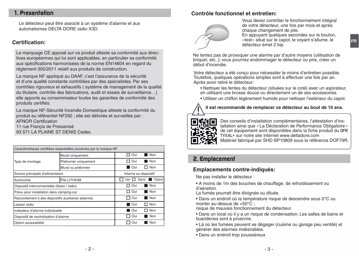- Utiliser un chiffon légèrement humide pour nettoyer l’extérieur du capot. Il est recommandé de remplacer ce détecteur au bout de 10 ans. Des conseils d’installation complémentaires, l’attestation d’installation ainsi que « La Déclaration de Performance Obligatoire » de cet équipement sont disponibles dans la fiche produit du DFR TYXAL+ sur notre site internet www.deltadore.com Matériel fabriqué par SHD BP10809 sous la référence DOF79R. Caractéristiques certifiées essentielles couvertes par la marque NF Type de montage Mural uniquement Oui Non Plafonnier uniquement Oui Non Oui Non Mural ou plafonnier Source principale d’alimentation Interne au dispositif Autonomie 1an Pile LITHIUM 5ans 10ans Dispositif interconnectable (filaire / radio) Oui Non Prévu pour installation dans camping-car Oui Non Raccordement à des dispositifs auxiliaires externes Oui Non Liaison radio Oui Non Indicateur d’alarme individuelle Oui Non Dispositif de neutralisation d’alarme Oui Non Option accessibilité Oui Non