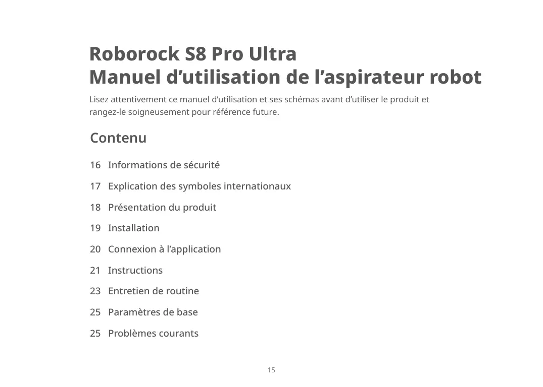 Roborock S8 Pro Ultra Manuel d’utilisation de l’aspirateur robot Lisez attentivement ce manuel d’utilisation et ses schémas avant d’utiliser le produit et rangez-le soigneusement pour référence future. Contenu 16 Informations de sécurité 17 Explication des symboles internationaux 18 Présentation du produit 19 Installation 20 Connexion à l’application 21 Instructions 23 Entretien de routine 25 Paramètres de base 25 Problèmes courants
